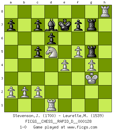 Last move : 1-0 2020 February 3 22:32:4 [Event "FICGS__CHESS__RAPID_D__000128"] [Site "FICGS"] [Date "2020.01.03"] [Round "1"] [White "Stevenson,John"] [Black "Leurette,Marc-Antoine"] [Result "1-0"] [WhiteElo "1700"] [BlackElo "1539"] 1.e4 e5 2.Nf3 Nc6 3.Bb5 Nf6 4.O-O Bc5 5.Nc3 O-O 6.Nxe5 Nxe5 7.d4 Bxd4 8.Qxd4 Nc6 9.Bxc6 bxc6 10.Bg5 h6 11.Bxf6 Qxf6 12.Qxf6 gxf6 13.f4 d6 14.f5 Bd7 15.g4 Kh7 16.Rad1 Rg8 17.h3 h5 18.Rf4 hxg4 19.hxg4 Rg5 20.Kf2 Kg7 21.Kg3 Kf8 22.Rf2 Ke7 23.Rh2 Rag8 24.Rh4 c5 25.Nd5+ Kd8 26.Nxf6 R8g7 27.Rh8+ Ke7 28.Nd5+ 1-0 Ruy Lopez : Berlin defense, Beverwijk variation Kingside Castling by player White (move 4) Kingside Castling by player Black (move 5) Player White won this chess game. Follow this game move after move (download)You may learn much more from a game you lose than from a game you win. You will have to lose hundreds of games before becoming a good player. (Jose Raul Capablanca) Offener Brief an US-Präsident Bush anlässlich der Verhaftung Bobby Fishers: Verhaften Sie mich. Stecken Sie mich in dieselbe Zelle wie Bobby Fisher und geben Sie uns ein Schachspiel mit. (Boris Vassilievich Spassky) Yo adoro todas la posiciones. Denme una partida posicional difícil, y la jugaré. Pero posiciones totalmente ganadas, no las tolero. (Hein Donner) Vous savez, camarade Pachman, je n'éprouve pas de plaisir à être ministre, je jouerais plutôt aux échecs comme vous, ou alors ferais une révolution au Venezuela. (Che Guevara à Ludek Pachman, 'Checkmate in Prague', 1975) Creativity is allowing yourself to make mistakes. Art is knowing which ones to keep. (Scott Adams)