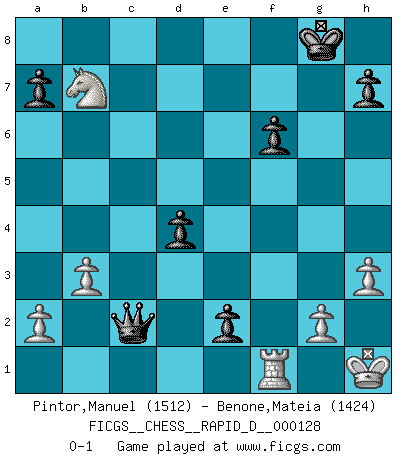 Last move : 0-1 2020 March 16 19:7:51 [Event "FICGS__CHESS__RAPID_D__000128"] [Site "FICGS"] [Date "2020.01.03"] [Round "1"] [White "Pintor,Manuel"] [Black "Benone,Mateia"] [Result "0-1"] [WhiteElo "1512"] [BlackElo "1424"] 1.e4 c5 2.f4 Nf6 3.Nc3 d6 4.Nf3 Nc6 5.Bc4 e6 6.d4 cxd4 7.Nxd4 Be7 8.Nxc6 bxc6 9.O-O O-O 10.Qf3 Bb7 11.f5 d5 12.exd5 cxd5 13.fxe6 fxe6 14.Bd3 e5 15.Qh3 e4 16.Be2 Qb6+ 17.Kh1 d4 18.Na4 Qc6 19.b3 Bc8 20.Qg3 Bd6 21.Bf4 Bxf4 22.Rxf4 Qxc2 23.Bc4+ Kh8 24.Raf1 e3 25.Rxf6 gxf6 26.h3 Bb7 27.Nc5 Rg8 28.Bxg8 Rxg8 29.Qxg8+ Kxg8 30.Nxb7 e2 0-1 Sicilian : Grand Prix attack Kingside Castling by player White (move 9) Kingside Castling by player Black (move 9) Player Black won this chess game. Follow this game move after move (download)Look at Garry Kasparov. After he loses, invariably he wins the next game. He just kills the next guy. That's something that we have to learn to be able to do. (Maurice Ashley) Du weisst es gibt ein Problem mit Computern und Fernschach, wenn jeder eine Rating von 2450 hat. (John Christen Knudsen) Diferente gente reacciona diferentemente en aceptar la derrota. (Bobby Fischer) Il n'y a plus de joueurs du niveau de Jacob Murray dont la seule quête est le beau jeu, le plaisir de voir les pièces construire quelque chose. Sur 10 idées à la minute, 9 seront sans intérêt, la dernière s'avèrera géniale. (Christian Bauer) Nobody is always a winner, and anybody who says he is, is either a liar or doesn't play poker. (Amarillo Slim)