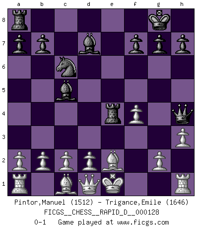 Last move : 0-1 2020 January 10 17:25:50 [Event "FICGS__CHESS__RAPID_D__000128"] [Site "FICGS"] [Date "2020.01.03"] [Round "1"] [White "Pintor,Manuel"] [Black "Trigance,Emile"] [Result "0-1"] [WhiteElo "1512"] [BlackElo "1646"] 1.e4 e5 2.f4 d5 3.exd5 e4 4.Nc3 Nf6 5.Bc4 Bc5 6.Nge2 O-O 7.h3 Re8 8.Bb5 c6 9.dxc6 Nxc6 10.Ng3 Bd7 11.Ngxe4 Nxe4 12.Nxe4 Rxe4+ 13.Be2 Qh4+ 0-1 KGD : Falkbeer, 3...e4 Kingside Castling by player Black (move 6) Player Black won this chess game. Follow this game move after move (download)No price is too great for the scalp of the enemy King. (Koblentz) Fallen sollten polizeilich verboten werden. (Savielly Grigorievitsch Tartakower) Los finales de Peón son del Ajedrez lo que el cesped es del Golf. (Cecil Purdy) La vie est comme un jeu d'échecs : nous esquissons un plan, mais celui-ci est tributaire de ce que daignent faire l'adversaire aux échecs et le destin dans la vie. (Arthur Schopenhauer) A person who never made a mistake never tried anything new. (Albert Einstein)