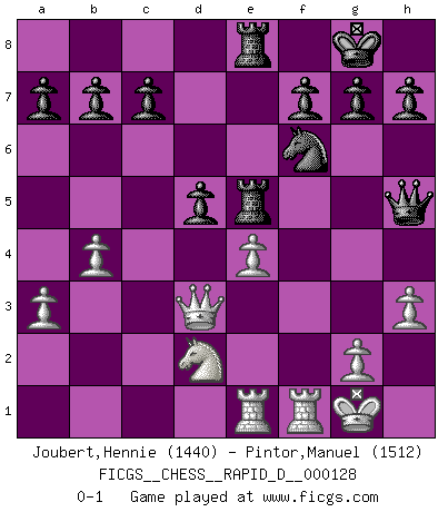 Last move : 0-1 2020 January 20 20:4:19 [Event "FICGS__CHESS__RAPID_D__000128"] [Site "FICGS"] [Date "2020.01.03"] [Round "1"] [White "Joubert,Hennie"] [Black "Pintor,Manuel"] [Result "0-1"] [WhiteElo "1440"] [BlackElo "1512"] 1.e4 e5 2.Nf3 Nc6 3.Bc4 Bc5 4.d4 exd4 5.c3 Qf6 6.O-O d6 7.Bg5 Qg6 8.cxd4 Nxd4 9.Nbd2 Bg4 10.Bf4 Nf6 11.Be2 Nxe2+ 12.Qxe2 O-O 13.Kh1 Qh5 14.a3 Rae8 15.Rae1 Re7 16.Qd3 Rfe8 17.b4 Bb6 18.Nd4 Bxd4 19.f3 Be5 20.Bxe5 Rxe5 21.fxg4 Nxg4 22.h3 d5 23.Kg1 Nf6 0-1 Giuoco Piano Kingside Castling by player White (move 6) Kingside Castling by player Black (move 12) Player Black won this chess game. Follow this game move after move (download)I thought the most common mistake [in chess] was the first one: Learning the game :P (Garvin Gray, FICGS forum) Um sich vor der Gefahr einer Erkältung zu schützen, sorge der wanderlustige König beizeiten für ein brauchbares Versteck. (Aaron Nimzowitsch) Tu cuerpo tiene que estar en óptima condición. Tu Ajedrez se deteriora como lo hace tu cuerpo. No puedes separar la mente y el cuerpo. (Bobby Fischer) Aucun coup ne doit être joué sans but. (Pedro Damiano) The beginning of wisdom is silence. The second step is listening. (Unknown)