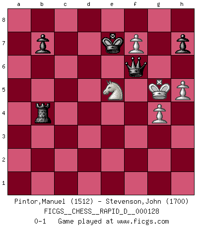 Last move : 0-1 2020 February 7 12:12:18 [Event "FICGS__CHESS__RAPID_D__000128"] [Site "FICGS"] [Date "2020.01.03"] [Round "1"] [White "Pintor,Manuel"] [Black "Stevenson,John"] [Result "0-1"] [WhiteElo "1512"] [BlackElo "1700"] 1.e4 c5 2.f4 Nc6 3.Nf3 d6 4.Bc4 g6 5.c3 e5 6.O-O Nf6 7.d3 Bg7 8.f5 gxf5 9.exf5 Bxf5 10.Ng5 d5 11.Bb5 Bg6 12.d4 cxd4 13.cxd4 e4 14.Qa4 Qd7 15.Bf4 a6 16.Nc3 O-O 17.Bxc6 Qxc6 18.Be5 Qxa4 19.Nxa4 Nd7 20.Bxg7 Kxg7 21.Rac1 Rac8 22.b4 Rxc1 23.Rxc1 e3 24.Nc5 Nxc5 25.Rxc5 Re8 26.Nf3 Be4 27.Ne1 Bb1 28.Rxd5 Bxa2 29.Rd7 Rc8 30.Re7 Be6 31.d5 Kf6 32.dxe6 Kxe7 33.exf7 Rc4 34.Kf1 Rxb4 35.Ke2 Rb2+ 36.Kxe3 a5 37.h4 a4 38.g4 a3 39.Nd3 Rb3 40.Ke4 a2 41.Ne5 a1Q 42.h5 Rb4+ 43.Kf5 Qf1+ 44.Kg5 Qf6+ 0-1 Sicilian : Grand Prix attack Kingside Castling by player White (move 6) Kingside Castling by player Black (move 16) 10 pieces endgame at move 36 : White KNPPP , Black KRPPP WHITE : King + 1 Knight 3 Pawns BLACK : King + 1 Rook 3 Pawns Promotion Queen by player Black (move 41) Player Black won this chess game. Follow this game move after move (download)Chess holds its master in its own bonds, shackling the mind and brain so that the inner freedom of the very strongest must suffer. (Albert Einstein) Wie kann ich Remis annehmen? Ich weiß ja gar nicht, wie ich stehe! (Fritz Sämisch) No hay un Gran Maestro de Ajedrez que sea normal; solo se diferencían ellos por la magnitud de su locura. (Viktor Korchnoi) A ce moment-là, je menaçais de comprendre la position ! (Clément L'Heureux) Wawaweewa ! (Borat: Cultural learnings of America for make benefit glorious nation of Kazakhstan)