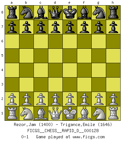 Last move : 0-1 2020 February 2 12:58:1 [Event "FICGS__CHESS__RAPID_D__000128"] [Site "FICGS"] [Date "2020.01.03"] [Round "1"] [White "Rezor,Jam"] [Black "Trigance,Emile"] [Result "0-1"] [WhiteElo "1400"] [BlackElo "1646"] 0-1 This chess game has been lost on time (started : 2020.01.03 2:28:17) Player Black won this chess game. Follow this game move after move (download)A good sacrifice is one that is not necessarily sound but leaves your opponent dazed and confused. (Rudolph Spielmann) Wir irren allesamt, nur jeder irrt anders. (Georg Christoph Lichtenberg) Después de la respuesta de las negras a 1.e4 con 1..e5, se quedan siempre tratando de entrar dentro del juego. (Howard Staunton) La guerre est enfant de la passion, la passion est enfant du narcissisme et le narcissisme est l'enfant. (...) Une autre partie ? (Thibault de Vassal) The human is the only animal species whose members are able to talk themselves into difficulties that would not otherwise exist. (Wendell Johnson)