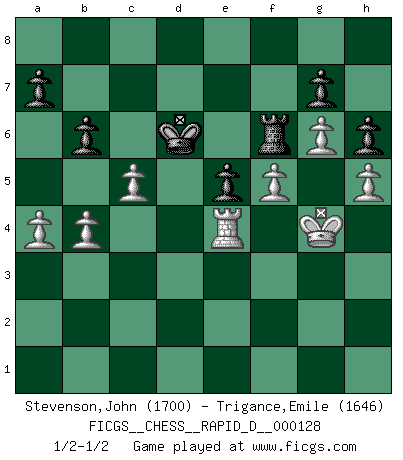Last move : 1/2-1/2 2020 April 16 5:49:59 [Event "FICGS__CHESS__RAPID_D__000128"] [Site "FICGS"] [Date "2020.01.03"] [Round "1"] [White "Stevenson,John"] [Black "Trigance,Emile"] [Result "1/2-1/2"] [WhiteElo "1700"] [BlackElo "1646"] 1.e4 e5 2.Nf3 f5 3.Nxe5 Qf6 4.d4 d6 5.Nc4 fxe4 6.Ne3 c6 7.d5 Qg6 8.c4 Nf6 9.Be2 Be7 10.Nc3 O-O 11.O-O Nbd7 12.f4 Nc5 13.f5 Qe8 14.b4 Ncd7 15.g4 h6 16.h4 Bd8 17.g5 Nh7 18.g6 Nhf6 19.Ng2 Bb6+ 20.Be3 Bxe3+ 21.Nxe3 Qe5 22.Rc1 Qg3+ 23.Ng2 Ne5 24.Qd2 Neg4 25.Qf4 Qxf4 26.Rxf4 Ne5 27.Ne3 Bd7 28.Rcf1 Rfd8 29.Nxe4 Nxe4 30.Rxe4 Rf8 31.Ref4 Rf6 32.h5 Rd8 33.a4 Re8 34.Ra1 Nd3 35.Bxd3 Rxe3 36.dxc6 Bxc6 37.Bc2 Re2 38.Rf2 Re5 39.Raf1 Be4 40.Bxe4 Rxe4 41.Rf4 Re2 42.R1f2 Re5 43.Kg2 Kf8 44.Kg3 Ke7 45.Kg4 b6 46.Rd2 Kd7 47.Rd5 Re1 48.R5d4 Re5 49.Rde4 Kc6 50.Rxe5 dxe5 51.Re4 Kd6 52.c5+ 1/2-1/2 Latvian : Nimzovich variation Kingside Castling by player Black (move 10) Kingside Castling by player White (move 11) This chess game ended in a draw. Follow this game move after move (download)It is the aim of the modern school, not to treat every position according to one general law, but according to the principle inherent in the position. (Richard Reti) Im Leben werden Partien nie so unstrittig gewonnen wie im Spiel (Emanuel Lasker) Te sientas frente a un tablero y repentinamente tu corazón brinca. Tu mano tiembla al tomar una pieza y moverla. Pero lo que el Ajedrez te enseña es que tu debes permanecer ahí con calma y pensar de que si realmente es una buena idea o de que si hay otras ideas mejores. (Stanley Kubrick) Le système Elo représente seulement une moyenne. Il est simplement un indicateur de votre stabilité. (Anatoli Karpov) The ultimate in disposing one's troops is to be without ascertainable shape. Then the most penetrating spies cannot pry in nor can the wise lay plans against you. (Sun Tzu)