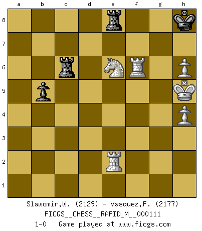 Last move : 1-0 2020 April 16 14:44:3 [Event "FICGS__CHESS__RAPID_M__000111"] [Site "FICGS"] [Date "2020.01.03"] [Round "1"] [White "Slawomir,Weglicki"] [Black "Vasquez,Fernando"] [Result "1-0"] [WhiteElo "2129"] [BlackElo "2177"] 1.e4 e5 2.d3 Nf6 3.Nf3 Nc6 4.g3 Bc5 5.Bg2 d6 6.O-O O-O 7.c3 a5 8.a4 Re8 9.Na3 Bg4 10.h3 Bd7 11.Kh2 h6 12.Nc2 Ba7 13.Be3 Nb8 14.Nd2 Bxe3 15.Nxe3 Na6 16.Qc2 Be6 17.Rad1 c6 18.d4 exd4 19.cxd4 Nb4 20.Qc1 Qe7 21.f4 Rad8 22.Nc2 Nxc2 23.Qxc2 Qc7 24.Qc3 Re7 25.Rc1 Rde8 26.b4 axb4 27.Qxb4 Qd8 28.a5 Bc8 29.Qc3 h5 30.e5 dxe5 31.dxe5 Nd5 32.Qf3 Qxa5 33.Nc4 Qa7 34.Rfe1 h4 35.Nd6 Rf8 36.gxh4 f5 37.Rc2 Qd4 38.Rc4 Qb6 39.Qg3 Be6 40.h5 Qb2 41.Rf1 Qe2 42.Rf3 Kh8 43.Rc1 Rc7 44.Rcf1 Ne7 45.Qh4 Nd5 46.R3f2 Qe3 47.Qg5 Qc3 48.h6 g6 49.Qxg6 Nxf4 50.Rxf4 Qxe5 51.Ne8 Rcf7 52.Ng7 Bc4 53.R1f2 Rg8 54.Qh5 Ra8 55.Qg5 Rg8 56.Be4 Rf6 57.Rg2 R6f8 58.Rg3 Be6 59.Bg2 Qf6 60.h4 Rf7 61.Ra4 f4 62.Rf3 Bd5 63.R3xf4 Qd6 64.Bxd5 cxd5 65.Kh3 Rc7 66.Qf6 Qxf6 67.Rxf6 b5 68.Raf4 Rc3+ 69.Kg4 d4 70.Kh5 d3 71.Ne6 d2 72.Rd4 Rc6 73.Rxd2 Re8 74.Re2 1-0 Variation Indian Opening : Indian Opening Kingside Castling by player White (move 6) Kingside Castling by player Black (move 6) 10 pieces endgame at move 73 : White KRRNPP , Black KRRP WHITE : King + 2 Rooks 1 Knight 2 Pawns BLACK : King + 2 Rooks 1 Pawn Player White won this chess game. Follow this game move after move (download)There are tough players and nice guys, and I'm a tough player. (Bobby Fischer) Habe Mut, dich deines eigenen Verstandes zu bedienen. (Immanuel Kant) Si yo gano un torneo, yo lo gano por mí mismo. Yo hago las jugadas. Nadie me ayuda. (Bobby Fischer) Les échecs, c'est l'imagination. (David Bronstein) Optimism is a variety of information deficit. Sometimes especially true for correspondence chess games. (Michael Aigner)