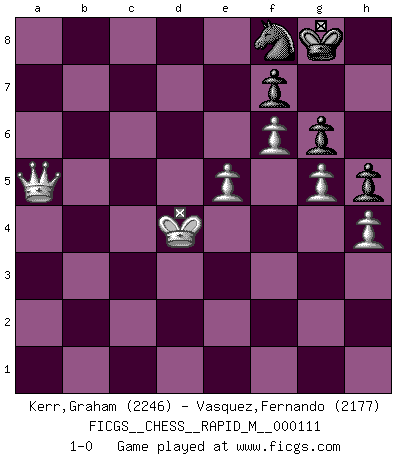 Last move : 1-0 2020 July 24 12:5:54 [Event "FICGS__CHESS__RAPID_M__000111"] [Site "FICGS"] [Date "2020.01.03"] [Round "1"] [White "Kerr,Graham"] [Black "Vasquez,Fernando"] [Result "1-0"] [WhiteElo "2246"] [BlackElo "2177"] 1.d4 Nf6 2.c4 e6 3.Nf3 b6 4.g3 Ba6 5.Nbd2 Bb7 6.Bg2 Be7 7.b3 a5 8.O-O O-O 9.Bb2 a4 10.Qc2 d5 11.bxa4 Bc6 12.cxd5 Bxa4 13.Qd3 exd5 14.Nb1 Nc6 15.Nc3 Nb4 16.Qb1 Bc2 17.Qc1 Bf5 18.Ne5 c5 19.dxc5 d4 20.a3 dxc3 21.Bxc3 Nc2 22.Ra2 Rc8 23.Rd1 Qc7 24.Nd3 Bxc5 25.Rxc2 Bd4 26.Qg5 Bg6 27.Rdc1 Bxc3 28.Rxc3 Qxc3 29.Rxc3 Rxc3 30.Qd2 Rxa3 31.Qb2 Ra5 32.Ne5 Rc5 33.Bf3 Bh5 34.Bxh5 Nxh5 35.Nd7 Re8 36.Nxc5 bxc5 37.Qb5 Rc8 38.Qd7 Rf8 39.Qf5 g6 40.Qxc5 Ng7 41.g4 h5 42.g5 Ne6 43.Qb5 Rc8 44.h4 Rc1+ 45.Kg2 Rc8 46.e3 Ng7 47.Qb3 Ne6 48.f3 Ra8 49.Qb1 Ra3 50.Kf2 Rc3 51.e4 Ra3 52.Qb2 Rd3 53.Qb8+ Rd8 54.Qb1 Rc8 55.Qb2 Rd8 56.Qc1 Rd3 57.f4 Rd4 58.Ke3 Ra4 59.f5 Nf8 60.Qc6 Ra3+ 61.Kd4 Ra5 62.Qc8 Kg7 63.Qd8 Ra3 64.f6+ Kg8 65.e5 Ra5 66.Qxa5 1-0 Queen's Indian : Nimzovich variation (exaggerated Fianchetto) Kingside Castling by player White (move 8) Kingside Castling by player Black (move 8) Player White won this chess game. Follow this game move after move (download)Chess opens and enriches your mind. (Saudin Robovic) Ohne Fehler kann es keine Brillanz geben. (Emanuel Lasker) Después de una mala apertura, hay una esperanza en el juego medio. Pero una vez que estas en finales, el momento de la verdad ha llegado. (Edmar Mednis) Si le désir cupide (et stupide) de gagner est une inépuisable source de souffrance, une combinaison brillante sur l'échiquier est une découverte : le coquelicot qui s'épanouit lorsque apparaît la Voie Lactée. (Arrabal) Gambling is the son of avarice and the father of despair. (French proverb)