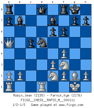 Last move : 1/2-1/2 2020 January 29 20:41:19 [Event "FICGS__CHESS__RAPID_M__000111"] [Site "FICGS"] [Date "2020.01.03"] [Round "1"] [White "Robin,Jean"] [Black "Farnik,Kym"] [Result "1/2-1/2"] [WhiteElo "2135"] [BlackElo "2176"] 1.d4 Nf6 2.Nf3 d5 3.c4 e6 4.g3 Bb4+ 5.Bd2 Be7 6.Bg2 O-O 7.O-O c6 8.Bf4 dxc4 9.Ne5 Nd5 10.Nxc4 Nxf4 11.gxf4 Nd7 12.Nc3 Nb6 13.Ne5 f6 14.Nf3 Nd5 15.Qd2 b6 16.e3 Bb7 17.Rfd1 Qe8 18.Ne2 c5 19.dxc5 bxc5 20.Qa5 Qd8 1/2-1/2 Queen's pawn game Kingside Castling by player Black (move 6) Kingside Castling by player White (move 7) This chess game ended in a draw. Follow this game move after move (download)I guess a certain amount of temperament is expected of Chess geniuses. (Ron Gross) Mit sehr nachdenklichem Gesicht schreitet Bobby durch den Turniersaal. Was ist passiert?, fragt Lombardy. Ich stehe schlecht, antwortet Fischer. Lombardy: Dann biete doch einfach Remis an. Fischer: So schlecht stehe ich nun auch wieder nicht! (Robert James Fischer) Un sacrificio se refuta mucho mejor al aceptarlo. (Wilhelm Steinitz) La vie est comme un jeu d'échecs : nous esquissons un plan, mais celui-ci est tributaire de ce que daignent faire l'adversaire aux échecs et le destin dans la vie. (Arthur Schopenhauer) Players are not good because they find tactics, it is about the way to find the positions in which those tactics are hidden. (Luc-Olivier Leclerc)