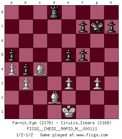Last move : 1/2-1/2 2020 January 30 0:22:21 [Event "FICGS__CHESS__RAPID_M__000111"] [Site "FICGS"] [Date "2020.01.03"] [Round "1"] [White "Farnik,Kym"] [Black "Cirulis,Ilmars"] [Result "1/2-1/2"] [WhiteElo "2176"] [BlackElo "2168"] 1.d4 d5 2.Bf4 Bf5 3.Nf3 e6 4.c4 dxc4 5.Nc3 Bb4 6.Bd2 c6 7.e3 b5 8.a4 Qb6 9.Nh4 Ne7 10.Nxf5 Nxf5 11.g4 Nh4 12.Bh3 Be7 13.O-O O-O 14.f4 c5 15.dxc5 Bxc5 16.Qe1 b4 17.Ne4 Be7 18.f5 Nd7 19.f6 Nxf6 20.Nxf6+ Bxf6 21.Rxf6 gxf6 22.Qxh4 Rfd8 23.Qf2 a5 24.Bf1 Rac8 25.Rc1 Qb7 26.Rxc4 Rxc4 27.Bxc4 Qe4 28.b3 Qxg4+ 29.Kf1 f5 30.Ke1 e5 31.Qg3 Qxg3+ 32.hxg3 Kg7 1/2-1/2 Queen's pawn, Mason variation Kingside Castling by player White (move 13) Kingside Castling by player Black (move 13) This chess game ended in a draw. Follow this game move after move (download)A passed Pawn increases in strength as the number of pieces on the board diminishes. (Capablanca) Dass jemand wie Surab Asmaiparaschwili, der selbst Elopunkte gekauft hat , Vize-Präsident der Fide werden konnte, sagt schon einges über den Zustand dieser Organisation aus. (Joel Lautier) Todos los Maestros de Ajedrez fueron un día unos principiantes. (Chernev) Aidez vos pièces, elles vous aideront. (Paul Morphy) Sometimes it pays to stay in bed in Monday, rather than spending the rest of the week debugging Monday's code. (Dan Salomon)