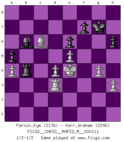Last move : 1/2-1/2 2020 April 11 15:59:1 [Event "FICGS__CHESS__RAPID_M__000111"] [Site "FICGS"] [Date "2020.01.03"] [Round "1"] [White "Farnik,Kym"] [Black "Kerr,Graham"] [Result "1/2-1/2"] [WhiteElo "2176"] [BlackElo "2246"] 1.d4 Nf6 2.Nf3 d5 3.Bf4 e6 4.e3 c5 5.a3 Nbd7 6.h3 Qb6 7.Nc3 a6 8.Be2 Nh5 9.dxc5 Bxc5 10.Bh2 Nhf6 11.O-O Be7 12.Qd4 Qxd4 13.exd4 O-O 14.a4 Nb8 15.Nb1 Bd7 16.Nbd2 Bc6 17.Ne5 a5 18.c3 Nbd7 19.Nxc6 bxc6 20.g4 h6 21.Kg2 Rfc8 22.Rfe1 Nb6 23.Bd3 Ra7 24.Nf3 g6 25.Re2 Bd8 26.Bf4 Kg7 27.Ne5 Nbd7 28.Be3 R7a8 29.f4 Nxe5 30.fxe5 Nh7 31.Kg3 g5 32.Rf1 Rc7 33.Rc2 Rb7 34.c4 dxc4 35.Rxc4 Nf8 36.Bc1 Rc8 37.Be4 Ng6 38.Rf3 Nf4 39.Bxf4 gxf4+ 40.Kxf4 Rxb2 41.Rxc6 Rxc6 42.Bxc6 Bb6 43.Rd3 Rb4 44.Ke4 1/2-1/2 Queen's pawn game Kingside Castling by player White (move 11) Kingside Castling by player Black (move 13) This chess game ended in a draw. Follow this game move after move (download)After a bad opening, there is hope for the middle game. After a bad middle game, there is hope for the endgame. But once you are in the endgame, the moment of truth has arrived. (Edmar Mednis) Schach wird sich dank seiner hohen kulturellen Tradition immer durchsetzen. In näherer Zukunft womöglich sogar als Gegenreaktion auf die maßlose Reizüberflutung im Freizeit- und Spielbereich. (Garry Kasparov) El Ajedrez se juega con la mente... ¡no con las manos!. (Renaud y Kahn) Les erreurs sont comme les malheurs, elles n'arrivent jamais seules. (Siegbert Tarrasch) A computer lets you make more mistakes faster than any invention in human history - with the possible exceptions of handguns and tequila. (Mitch Ratcliffe)