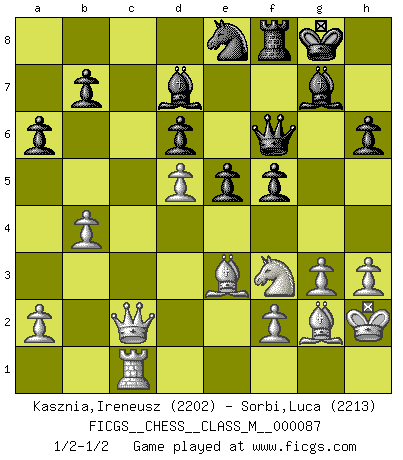 Last move : 1/2-1/2 2020 March 31 19:40:41 [Event "FICGS__CHESS__CLASS_M__000087"] [Site "FICGS"] [Date "2020.01.03"] [Round "1"] [White "Kasznia,Ireneusz"] [Black "Sorbi,Luca"] [Result "1/2-1/2"] [WhiteElo "2202"] [BlackElo "2213"] 1.Nf3 Nf6 2.g3 g6 3.Bg2 Bg7 4.c4 O-O 5.d4 d6 6.Nc3 Nbd7 7.O-O e5 8.e4 c6 9.h3 Qb6 10.d5 Nc5 11.Qc2 cxd5 12.cxd5 Bd7 13.Be3 Rac8 14.Rfc1 Qd8 15.Nd2 Ne8 16.b4 Na4 17.Qd3 Rxc3 18.Rxc3 Nxc3 19.Qxc3 a6 20.Rc1 f5 21.Nf3 h6 22.exf5 gxf5 23.Qd2 Qf6 24.Kh2 Rf7 25.Rg1 Nc7 26.Rc1 Ne8 27.Qc2 Rf8 1/2-1/2 Reti : King's Indian attack Kingside Castling by player Black (move 4) Kingside Castling by player White (move 7) This chess game ended in a draw. Follow this game move after move (download)Fischer was a master of clarity and a king of artful positioning. His opponents would see where he was going but were powerless to stop him. (Bruce Pandolfini) Frage des Reporters: -Welche besonderen Umstände rechtfertigen das Anhalten der Uhren während einer Turnierpartie? Antwort: -Einen Fotographen zu strangulieren. (Siegbert Tarrasch) Cuando tengo las piezas blancas, yo gano porque soy blanco; Cuando tengo las piezas negras, yo gano porque soy Bogolyubov. (Bogolyubov) Comme les marins qui ont mille raisons différentes d'aller en mer, les joueurs d'échecs en ont tout autant avant de s'installer devant une table et jouer... (Vincent Bertignac, philosophe) Art is not a thing, it is a way. (Elbert Hubbard)