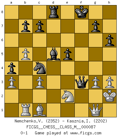 Last move : 0-1 2020 January 12 20:2:41 [Event "FICGS__CHESS__CLASS_M__000087"] [Site "FICGS"] [Date "2020.01.03"] [Round "1"] [White "Nemchenko,Valery"] [Black "Kasznia,Ireneusz"] [Result "0-1"] [WhiteElo "2352"] [BlackElo "2202"] 1.c4 Nf6 2.Nc3 e5 3.g3 Bb4 4.a3 Bxc3 5.dxc3 d6 6.Bg2 h6 7.e4 Be6 8.b3 Nbd7 9.Ne2 a5 10.h3 a4 11.b4 Nb6 12.O-O Nxc4 13.Rb1 d5 14.f4 Nxe4 15.Kh2 f6 16.fxe5 fxe5 17.Qc2 Rf8 18.Rxf8+ Kxf8 19.Bxe4 dxe4 20.Qxe4 Qf6 21.Qg2 Rd8 22.b5 Bd5 23.Qg1 Qf3 0-1 English Opening Kingside Castling by player White (move 12) Player Black won this chess game. Follow this game move after move (download)Live, lose, and learn, by observing your opponent how to win. (Amber Steenbock) Die jungen Leute sollen verstehen, dass sie noch etwas von mir lernen können und müssen. (Viktor Kortschnoi) El jugador de combinación piensa hacia adelante; comienza de la posición dada y trabaja las movidas contundentes en su mente. (Emanuel Lasker) Tout change constamment, y compris dans le monde des Echecs. (Botvinnik) Nothing is more important for teaching us to understand the concepts we have than constructing fictitious ones. (Ludwig Wittgenstein)