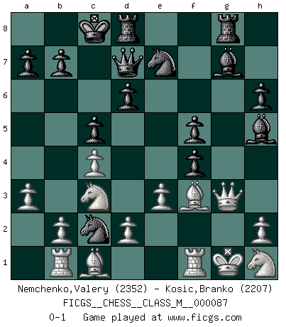Last move : 0-1 2020 January 25 7:40:47 [Event "FICGS__CHESS__CLASS_M__000087"] [Site "FICGS"] [Date "2020.01.03"] [Round "1"] [White "Nemchenko,Valery"] [Black "Kosic,Branko"] [Result "0-1"] [WhiteElo "2352"] [BlackElo "2207"] 1.c4 c5 2.Nc3 Nc6 3.g3 g6 4.Bg2 Bg7 5.Nf3 e5 6.O-O d6 7.e3 Nge7 8.Ng5 h6 9.Nh3 Bf5 10.f4 Qd7 11.Nf2 exf4 12.gxf4 g5 13.Nfe4 Bg4 14.Qe1 f5 15.Nf2 Bh5 16.Nh1 Nb4 17.Qg3 O-O-O 18.a3 Nc2 19.Rb1 Rhg8 20.Bf3 gxf4 0-1 English : Symmetrical, Botvinnik system Reversed Kingside Castling by player White (move 6) Queenside Castling by player Black (move 17) Player Black won this chess game. Follow this game move after move (download)Chess is really ninety nine percent calculation. (Soltis) Das typische an einem Großmeister ist, daß er eine gewonnene Position schnell und schmerzlos gewinnt. (Irving Chernev) El Ajedrez era la lengua materna de Capablanca. (Reti) Vous m'avez demandé de vous exposer quel est le fondement de la prière. Je ne fais que préparer les pièces du jeu sur la table... Nous sera-t-il permis d'en adopter les règles et si nous les appliquons scrupuleusement nous ne tarderons pas à faire mat le Roi divin ! Il ne pourra échapper à nos mains. (Sainte Thérèse d'Avila, Chemin de perfection) If passion drives you, let reason holds the reins. (Benjamin Franklin)