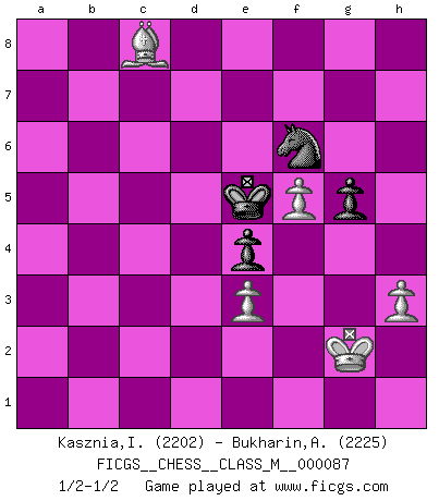 Last move : 1/2-1/2 2020 June 24 18:10:37 [Event "FICGS__CHESS__CLASS_M__000087"] [Site "FICGS"] [Date "2020.01.03"] [Round "1"] [White "Kasznia,Ireneusz"] [Black "Bukharin,Alexey"] [Result "1/2-1/2"] [WhiteElo "2202"] [BlackElo "2225"] 1.Nf3 f5 2.g3 Nf6 3.Bg2 g6 4.d4 Bg7 5.O-O O-O 6.c4 d6 7.Nc3 Qe8 8.d5 a5 9.Re1 Na6 10.Be3 Ng4 11.Bd4 Ne5 12.a3 h6 13.Nxe5 dxe5 14.Be3 Bd7 15.b4 axb4 16.axb4 Nxb4 17.Qb3 Na6 18.Qxb7 Qb8 19.d6 e4 20.Qd5+ e6 21.Qd2 cxd6 22.Bxh6 Qc7 23.Rab1 Rab8 24.Nb5 Bxb5 25.cxb5 Nc5 26.f3 Bxh6 27.Qxh6 Qg7 28.Qe3 Qe5 29.Rec1 Kf7 30.b6 Rb7 31.fxe4 Rfb8 32.Qh6 Nxe4 33.Rc6 Rh8 34.Qe3 Nf6 35.Qxe5 dxe5 36.Rxe6 e4 37.Rc6 Re8 38.e3 Re6 39.Rxe6 Kxe6 40.Bf1 Nd7 41.Bb5 Nxb6 42.Be8 Kf6 43.Bc6 Rb8 44.Kg2 g5 45.g4 Nd7 46.Rxb8 Nxb8 47.Bb7 Ke5 48.gxf5 Nd7 49.h3 Nf6 50.Bc8 1/2-1/2 Reti v Dutch Kingside Castling by player White (move 5) Kingside Castling by player Black (move 5) 10 pieces endgame at move 46 : White KBPPP , Black KNPPP WHITE : King + 1 Bishop 3 Pawns BLACK : King + 1 Knight 3 Pawns 9 pieces endgame at move 48 : White KBPPP , Black KNPP WHITE : King + 1 Bishop 3 Pawns BLACK : King + 1 Knight 2 Pawns This chess game ended in a draw. Follow this game move after move (download)I prefer to lose a really good game than to win a bad one. (David Levy) Die Fehler sind da, Sie warten nur darauf gemacht zu werden. (Savielly Grigorievitsch Tartakower) En el Ajedrez, cuando menos, el valiente hereda la tierra. (Edmar Mednis) Il a essayé de se convaincre qu'il pourrait empêcher toutes les erreurs et ne jamais perdre. L'horreur ! Gary Kasparov au sujet de Robert Fischer. Animated gif is worth one mega-word. (Unknown)