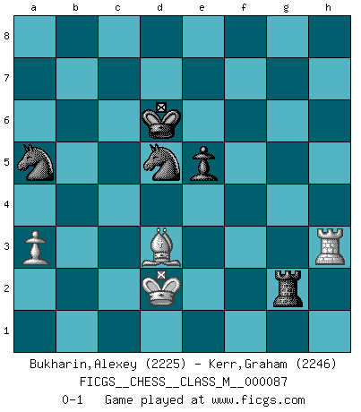 Last move : 0-1 2021 October 22 22:48:4 [Event "FICGS__CHESS__CLASS_M__000087"] [Site "FICGS"] [Date "2020.01.03"] [Round "1"] [White "Bukharin,Alexey"] [Black "Kerr,Graham"] [Result "0-1"] [WhiteElo "2225"] [BlackElo "2246"] 1.e4 c5 2.Nf3 d6 3.d4 cxd4 4.Nxd4 Nf6 5.Nc3 a6 6.Bg5 Nbd7 7.f4 Qc7 8.Qf3 b5 9.O-O-O e6 10.Bd3 Bb7 11.Rhe1 Be7 12.Qg3 h6 13.Bh4 g5 14.fxg5 hxg5 15.Bxg5 Rg8 16.h4 b4 17.Nd5 exd5 18.Nf5 Bf8 19.exd5 Ne5 20.Kb1 Nfd7 21.Qf4 f6 22.Bh6 Nc5 23.Bxf8 Rxf8 24.Be2 O-O-O 25.Qxb4 Kb8 26.Rd4 Ka8 27.Rf1 Rb8 28.Qd2 Bc8 29.h5 Rb7 30.g4 Bxf5 31.Rxf5 a5 32.R5f4 Qb6 33.b3 Rc8 34.Bd1 Ncd7 35.Ra4 Ra7 36.a3 Nc5 37.Rad4 a4 38.b4 Ncd7 39.Be2 Rac7 40.c4 Nc5 41.Qb2 Rb7 42.Qc3 Nb3 43.Rd1 Na5 44.Qd4 Qd8 45.Qc3 Qb6 46.Qd4 Qd8 47.Qc3 Kb8 48.R1d4 Nb3 49.Rde4 Qg8 50.Rf5 Nc5 51.Rd4 Ncd7 52.Qc1 Rbc7 53.Rf1 Nb6 54.c5 dxc5 55.bxc5 Rxc5 56.Qb2 Qd8 57.h6 Qd6 58.h7 Ka7 59.Rh1 Rh8 60.Ka1 Rc7 61.Rb1 Rcxh7 62.Rb4 Ned7 63.Rxa4+ Kb8 64.Rb4 Rh1 65.Bf1 Kc7 66.Qc1+ Kd8 67.Qf4 Ne5 68.Bg2 Rxb1+ 69.Kxb1 Rg8 70.Qd4 Nbd7 71.Qd2 Nxg4 72.Ra4 Ke7 73.Qc2 Rg7 74.Ka2 Nge5 75.Bh1 Nb6 76.Rh4 Nec4 77.Rh3 Qe5 78.Qh2 Kd6 79.Kb3 Rg1 80.Be4 Rg4 81.Qxe5+ fxe5 82.Bd3 Na5+ 83.Kc2 Nxd5 84.Kd2 Rg2+ 0-1 Graham Kerr gg, thanks ;-) Follow this game move after move (download)The Chess pieces are the block alphabet which shapes thoughts; and these thoughts, although making a visual design on the chessboard, express their beauty abstractly, like a poem. (Marcel Duchamp) Aljechin war kein Nazi. Er war ein Opportunist. Ein schrecklicher Mann. Er liebte Geld über alles und würde für Geld ein Jude, ein Katolik oder ein Protestant werden. (Miguel Najdorf) Preferería tener un Peón que un dedo. (Reuben Fine) Toutes les manuvres exécutées sur une colonne ouverte ont pour but ultime l'intrusion définitive sur la septième ou la huitième rangée, en plein cur de la position ennemie. (Aaron Nimzovitch) Those who make the worst use of their time are the first to complain of its brevity. (Jean de la Bruyere)