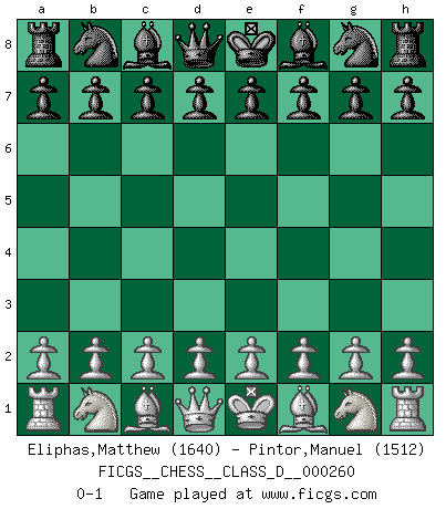 Last move : 0-1 2020 February 12 22:30:5 [Event "FICGS__CHESS__CLASS_D__000260"] [Site "FICGS"] [Date "2020.01.03"] [Round "1"] [White "Eliphas,Matthew"] [Black "Pintor,Manuel"] [Result "0-1"] [WhiteElo "1640"] [BlackElo "1512"] 0-1 This chess game has been lost on time (started : 2020.01.03 14:17:32) Player Black won this chess game. Follow this game move after move (download)On the chessboard, lies and hypocrisy do not survive long. (Emanuel Lasker) Mein Name ist Rustam Kamsky. Sie haben meinen Sohn belästigt. Bereiten Sie sich aufs Sterben vor. (Rustam Kamsky) El Ajedrez hace al hombre ser mas sabio y ver mas claro. (Vladimir Putin) On a dit que l'homme se distingue de l'animal par le fait qu'il achète plus de livres qu'il ne peut en lire. Je voudrais suggérer qu'inclure à la liste des livres quelques livres d'échecs rendrait la distinction manifeste. (Edward Lasker) Statistics can be made to prove anything - even the truth. (Author unknown)