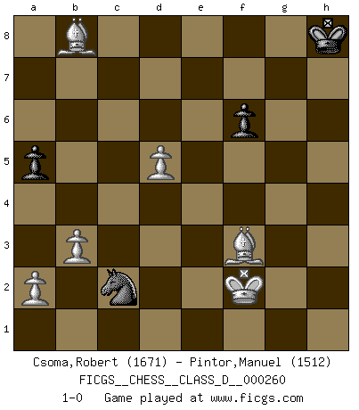 Last move : 1-0 2020 February 7 18:23:3 [Event "FICGS__CHESS__CLASS_D__000260"] [Site "FICGS"] [Date "2020.01.03"] [Round "1"] [White "Csoma,Robert"] [Black "Pintor,Manuel"] [Result "1-0"] [WhiteElo "1671"] [BlackElo "1512"] 1.c4 e5 2.Nc3 Bc5 3.e3 Bb6 4.d4 exd4 5.exd4 c6 6.Nf3 d6 7.Be2 Nf6 8.O-O O-O 9.h3 h6 10.Be3 Ba5 11.Rc1 Bxc3 12.Rxc3 Ne4 13.Rc1 Qf6 14.Bd3 Ng5 15.Nxg5 hxg5 16.Qc2 Qh6 17.Qd2 f6 18.f4 Bxh3 19.fxg5 Qh4 20.gxf6 Rxf6 21.Rxf6 gxf6 22.gxh3 Qxh3 23.Qg2+ Qxg2+ 24.Kxg2 Nd7 25.Bf4 d5 26.cxd5 cxd5 27.Rc7 Nb6 28.Rxb7 Na4 29.b3 Nb2 30.Bf5 a5 31.Be6+ Kh8 32.Bxd5 Rd8 33.Rb8 Rxb8 34.Bxb8 Nd1 35.Bf3 Ne3+ 36.Kf2 Nc2 37.d5 1-0 English Opening Kingside Castling by player White (move 8) Kingside Castling by player Black (move 8) 10 pieces endgame at move 34 : White KBBPPP , Black KNPP WHITE : King + 2 Bishops 3 Pawns BLACK : King + 1 Knight 2 Pawns Player White won this chess game. Follow this game move after move (download)Human affairs are like a Chess game: only those who do not take it seriously can be called good players. (Hung Tzu Ch'eng) Die unerbitterlichsten Regeln im Schach sind die Ausnahmen. (Savielly Grigorievitsch Tartakower) La maestría del Ajedrez consiste esencialmente en analizar posiciónes de Ajedrez con precisión. (Mikhail Botvinnik) Les pièces de l'échiquier étaient impitoyables. Elles le retenaient, elles l'absorbaient. Il y avait de l'horreur en cela, mais aussi une harmonie unique. Car, qu'y a-t-il dans le monde, à part les échecs ? (V. Nabokov) Strategy without tactics is the slowest route to victory. Tactics without strategy is the noise before defeat. (Sun Tzu)