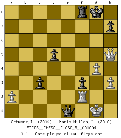 Last move : 0-1 2006 September 6 22:22:40 [Event "FICGS__CHESS__CLASS_B__000004"] [Site "FICGS"] [Date "2006.06.19"] [Round "1"] [White "Schwarz,Ingo"] [Black "Marin Millan,Jose Antonio"] [Result "0-1"] [WhiteElo "2004"] [BlackElo "2010"] 1.e4 e5 2.Nf3 Nc6 3.d4 exd4 4.Nxd4 Nf6 5.Nxc6 bxc6 6.Bd3 d5 7.O-O Be7 8.e5 Nd7 9.f4 O-O 10.c3 Nc5 11.Bc2 f6 12.b4 Ne4 13.Qe2 f5 14.g3 a5 15.bxa5 Ba6 16.Bd3 Bxd3 17.Qxd3 Rxa5 18.Be3 Qa8 19.Qc2 Qa6 20.Nd2 Ra8 21.Nxe4 fxe4 22.Rf2 Qc4 23.f5 Ra3 24.f6 Rxc3 25.Qb2 gxf6 26.exf6 Bxf6 27.Rxf6 Rxe3 28.Qe5 Qc3 29.Qg5+ Kh8 30.Raf1 Rf3 31.R6xf3 exf3 32.Qf4 c5 33.Qxc7 Qe3+ 34.Rf2 Rf8 35.h3 c4 36.Qd6 Rc8 37.Qf6+ Kg8 38.Qh4 Rf8 39.g4 c3 40.Qh5 Qe1+ 0-1 Scotch : Schmidt variation Kingside Castling by player White (move 7) Kingside Castling by player Black (move 9) Player Black won this chess game. Follow this game move after move (download)Everything is in a state of flux, and this includes the world of Chess. (Mikhail Botvinnik) Ich verstehe mehr vom Schach als irgendein anderer lebender Meister. (José Raúl Capablanca) En manos de Fischer's, una diminuta ventaja teórica es tan buena como tener una Reina de ventaja. (Isaac Kashdan) Le jeu d'échecs est comme rejeté hors du temps. (Antoine de Saint-Exupéry) If you lose the game you should win the analysis! (Proverb)