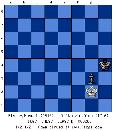 Last move : 1/2-1/2 2020 April 20 19:1:27 [Event "FICGS__CHESS__CLASS_D__000260"] [Site "FICGS"] [Date "2020.01.03"] [Round "1"] [White "Pintor,Manuel"] [Black "D Ottavio,Aldo"] [Result "1/2-1/2"] [WhiteElo "1512"] [BlackElo "1716"] 1.e4 c5 2.f4 d5 3.exd5 Qxd5 4.Nc3 Qd8 5.Nf3 Nc6 6.Bc4 e6 7.O-O Nh6 8.Ne2 Be7 9.d4 O-O 10.d5 Na5 11.b3 Nxc4 12.bxc4 exd5 13.Qxd5 Be6 14.Qxb7 Bxc4 15.Re1 Bd5 16.Qa6 Bxf3 17.gxf3 Nf5 18.Ng3 Qd4+ 19.Kg2 Qxa1 20.Nxf5 Bf6 21.Qa3 Qc3 22.Qxc3 Bxc3 23.Re7 Rfe8 24.Be3 Rxe7 25.Nxe7+ Kh8 26.Bxc5 Re8 27.Kh3 a5 28.Nd5 Be1 29.Bb6 Rc8 30.Ne3 a4 31.c4 Rc6 32.Nc2 Bd2 33.c5 Bxf4 34.Nb4 Rh6+ 35.Kg4 Bxh2 36.Nd5 Bg1 37.Nc3 a3 38.Nb1 Rc6 39.Nxa3 Bxc5 40.Bxc5 Rxc5 41.Nb1 Rc1 42.Nd2 Rc2 43.Ne4 Rxa2 44.Ng5 Kg8 45.Kf4 Ra5 46.Ne4 h6 47.Nd6 Kh7 48.Nxf7 g5+ 49.Kg4 Kg6 50.Nd6 h5+ 51.Kg3 Ra4 52.Ne4 Rb4 53.Nd6 h4+ 54.Kh3 Kh5 55.Ne8 Rf4 56.Kg2 h3+ 57.Kg3 h2 58.Kxh2 Rxf3 59.Ng7+ Kh4 60.Ne6 g4 61.Kg2 Rf6 62.Nd4 Ra6 63.Nf5+ Kg5 64.Nd4 Rf6 65.Ne2 Kh4 66.Ng3 Rf3 67.Nf1 Rh3 68.Nh2 Rg3+ 69.Kh1 Rh3 70.Kg2 Rxh2+ 71.Kxh2 g3+ 72.Kg1 Kg4 73.Kg2 Kh4 1/2-1/2 Sicilian : Grand Prix attack Kingside Castling by player White (move 7) Kingside Castling by player Black (move 9) 10 pieces endgame at move 40 : White KBNPP , Black KRPPP WHITE : King + 1 Bishop 1 Knight 2 Pawns BLACK : King + 1 Rook 3 Pawns 9 pieces endgame at move 40 : White KNPP , Black KRPPP WHITE : King + 1 Knight 2 Pawns BLACK : King + 1 Rook 3 Pawns 8 pieces endgame at move 43 : White KNP , Black KRPPP WHITE : King + 1 Knight 1 Pawn BLACK : King + 1 Rook 3 Pawns 7 pieces endgame at move 48 : White KNP , Black KRPP WHITE : King + 1 Knight 1 Pawn BLACK : King + 1 Rook 2 Pawns 6 pieces endgame at move 58 : White KNP , Black KRP WHITE : King + 1 Knight 1 Pawn BLACK : King + 1 Rook 1 Pawn 5 pieces endgame at move 58 : White KN , Black KRP WHITE : King + 1 Knight BLACK : King + 1 Rook 1 Pawn 4 pieces endgame at move 70 : White K , Black KRP WHITE : King + BLACK : King + 1 Rook 1 Pawn 3 pieces endgame at move 71 : White K , Black KP WHITE : King + BLACK : King + 1 Pawn This chess game ended in a draw. Follow this game move after move (download)Avoid the crowd. Do your own thinking independently. Be the Chess player, not the Chess piece. (Ralph Charell) Wie ich sie so einen nach dem anderen nieder mähte wurde meine Überlegenheit offensichtlich. (José Raúl Capablanca) Cuando le juegas a Fischer, no es una cuestion de si vas a ganar o perder. Es una cuestion de si vas a sobrevivir. (Boris Spassky) Aux échecs, les retours au sommet sont rares : les dommages psychologiques consécutifs à une défaite sont trop sévères. (Daily Telegraph) All politicians must be presumed guilty until they are proven innocent. (Dinesh De Silva)