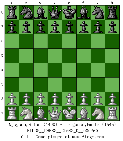 Last move : 0-1 2020 February 12 22:30:5 [Event "FICGS__CHESS__CLASS_D__000260"] [Site "FICGS"] [Date "2020.01.03"] [Round "1"] [White "Njuguna,Allan"] [Black "Trigance,Emile"] [Result "0-1"] [WhiteElo "1400"] [BlackElo "1646"] 0-1 This chess game has been lost on time (started : 2020.01.03 14:17:32) Player Black won this chess game. Follow this game move after move (download)The Pin is mightier than the sword. (Fred Reinfeld) Ich tröste mich mit dem Vergnügen, daß Schachfans, Zuschauer und Leser glücklich sind, wenn ein Großmeister etwas riskiert, statt nur Klötzchen zu schieben. (Mikhail Nekhemyevich Tal) Muchos se han convertido en Maestros de Ajedrez, nadie se ha convertido en el Maestro del Ajedrez. (Siegbert Tarrasch) La vie et les Echecs sont tous les deux une lutte constante. (Lasker) To send light into the darkness of men's hearts - such is the duty of the artist. (Schumann)