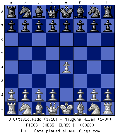 Last move : 1-0 2020 February 12 22:30:5 [Event "FICGS__CHESS__CLASS_D__000260"] [Site "FICGS"] [Date "2020.01.03"] [Round "1"] [White "D Ottavio,Aldo"] [Black "Njuguna,Allan"] [Result "1-0"] [WhiteElo "1716"] [BlackElo "1400"] 1.e4 1-0 This chess game has been lost on time (started : 2020.01.03 14:17:32) King's pawn Opening Player White won this chess game. Follow this game move after move (download)A thorough understanding of the typical mating continuations makes the most complicated sacrificial combinations leading up to them not only not difficult, but almost a matter of course. (Siegbert Tarrasch) Es ist besser die Steine des Gegners zu opfern. (Savielly Grigorievitsch Tartakower) Debes de llevar a tu oponente hacia un profundo y obscuro bosque donde 2+2=5, y el camino que conduce a la salida es suficientemente ancho para solamente uno. (Mikhail Tal) Le génie consiste à savoir transgresser les règles au moment opportun. (Teichmann) The faster the computer, the slower the brain. (Thibault de Vassal)