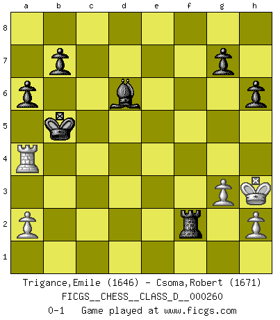 Last move : 0-1 2020 March 6 16:52:51 [Event "FICGS__CHESS__CLASS_D__000260"] [Site "FICGS"] [Date "2020.01.03"] [Round "1"] [White "Trigance,Emile"] [Black "Csoma,Robert"] [Result "0-1"] [WhiteElo "1646"] [BlackElo "1671"] 1.d4 f5 2.e4 fxe4 3.Nc3 Nf6 4.f3 exf3 5.Nxf3 e6 6.Bd3 Be7 7.Qe2 O-O 8.O-O c5 9.Kh1 a6 10.Be3 Qc7 11.Qf2 Ng4 12.Qg1 Nxe3 13.Qxe3 cxd4 14.Nd5 dxe3 15.Nxc7 Ra7 16.Rfe1 Bc5 17.Ng5 h6 18.Ne4 Bb6 19.Nd6 Bxc7 20.Nxc8 Rxc8 21.Rxe3 Bf4 22.Rf3 Be5 23.c3 Nc6 24.Raf1 Bf6 25.R3f2 R7a8 26.Re1 Ne5 27.Bf1 Rf8 28.Kg1 Ng4 29.Rf3 Ne5 30.Rfe3 Nc6 31.g3 Na5 32.Kg2 Rf7 33.Bd3 Bg5 34.R3e2 Raf8 35.Rd1 Bd8 36.Red2 Bb6 37.Bf1 Rf2+ 38.Rxf2 Rxf2+ 39.Kh3 Nc6 40.Bg2 d5 41.Re1 Kf7 42.Rb1 Ne7 43.c4 Bd4 44.cxd5 exd5 45.Rd1 Bxb2 46.Bxd5+ Nxd5 47.Rxd5 Ke6 48.Ra5 Be5 49.Ra3 Bd6 50.Ra4 Kd5 51.Ra5+ Kc4 52.Ra4+ Kb5 0-1 Dutch : Staunton gambit Kingside Castling by player Black (move 7) Kingside Castling by player White (move 8) Player Black won this chess game. Follow this game move after move (download)Chess is a sea in which a gnat may drink and an elephant may bathe. (Hindu proverb) Lisa Lane, amerikanische Schachmeisterin, hatte Fischer einmal als stärksten lebenden Spieler bezeichnet. Antwort: Das ist richtig, aber Lisa Lane ist eigentlich nicht in der Lage, das zu beurteilen. (Robert James Fischer) Un entendimiento a fondo de las continuaciones típicas del mate, hace de las combinaciones de sacrificio mas complicadas conducirlas a ellas no solo sin dificultad, sino casi de una manera natural. (Siegbert Tarrasch) Il (Jacob Murray) ne joue pas pour le bon coup, mais pour le meilleur. (Eloi Relange) I don't know, I don't care, and it doesn't make any difference. (Albert Einstein)