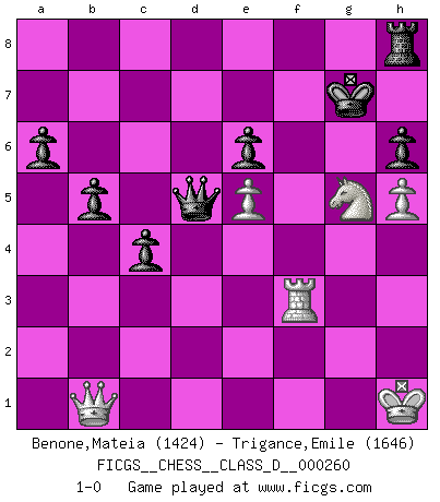 Last move : 1-0 2020 July 12 18:52:46 [Event "FICGS__CHESS__CLASS_D__000260"] [Site "FICGS"] [Date "2020.01.03"] [Round "1"] [White "Benone,Mateia"] [Black "Trigance,Emile"] [Result "1-0"] [WhiteElo "1424"] [BlackElo "1646"] 1.Nf3 d5 2.d4 Nf6 3.c4 c6 4.Nc3 dxc4 5.e4 b5 6.e5 Nd5 7.a4 e6 8.axb5 Nxc3 9.bxc3 cxb5 10.Be2 Bb7 11.O-O Be7 12.Ba3 Bxa3 13.Rxa3 O-O 14.Qb1 Qd5 15.Ne1 Qd7 16.Bf3 Bxf3 17.Nxf3 a6 18.Ng5 g6 19.f4 Qd5 20.Ne4 Nd7 21.Nd6 Nb6 22.Ne4 Nd7 23.g4 f5 24.gxf5 Rxf5 25.Nd6 R5f8 26.Ra5 Nb8 27.Ra2 Nc6 28.Rg2 Nxd4 29.cxd4 Qxd4+ 30.Kh1 Rxf4 31.Rxg6+ Kh8 32.Rxf4 Qxf4 33.Rf6 Qd4 34.Nf7+ Kg7 35.Ng5 Qd5+ 36.Rf3 Rh8 37.h4 h6 38.h5 1-0 Reti Opening Kingside Castling by player White (move 11) Kingside Castling by player Black (move 13) Player White won this chess game. Follow this game move after move (download)A bad plan is better than none at all. (Frank Marshall) Wenn sie aufgeben, dann danke ich Ihnen für das Spiel (Eventualzug beim Fernschach). (Anonymous) La enorme capacidad mental, en la que sin ella no puede un jugador de Ajedrez existir, es demasiado requerida por el Ajedrez al grado de que nunca podrá liberar su mente de este juego. (Albert Einstein) Je fais ceci parce que dans cinquante coups j'obtiendrai cela; je m'appelle Mikhail Moisevitch Botvinnik. (Botvinnik) All war is based on deception. (Sun Tzu)
