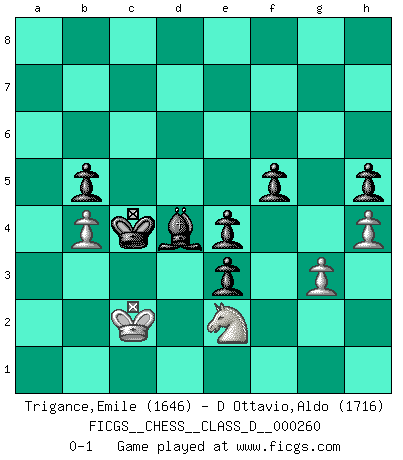 Last move : 0-1 2020 March 29 16:12:55 [Event "FICGS__CHESS__CLASS_D__000260"] [Site "FICGS"] [Date "2020.01.03"] [Round "1"] [White "Trigance,Emile"] [Black "D Ottavio,Aldo"] [Result "0-1"] [WhiteElo "1646"] [BlackElo "1716"] 1.d4 Nf6 2.Bg5 Ne4 3.Bf4 Nc6 4.Nf3 d5 5.Nbd2 g5 6.Bg3 h5 7.Nxe4 dxe4 8.Nxg5 Qd5 9.h4 f6 10.Nh3 Qxd4 11.Qxd4 Nxd4 12.O-O-O e5 13.e3 Nf5 14.Bc4 c6 15.Rd2 Bc5 16.Rhd1 Ke7 17.Ng1 Nxg3 18.fxg3 Bg4 19.Re1 Rad8 20.c3 Rxd2 21.Kxd2 Rd8+ 22.Kc2 b5 23.Be2 Rg8 24.Kd2 Rd8+ 25.Kc2 Bxe2 26.Rxe2 Rg8 27.b4 Bb6 28.Kb3 Rxg3 29.Nh3 Rxe3 30.Rxe3 Bxe3 31.a4 a6 32.axb5 axb5 33.c4 Bd4 34.cxb5 cxb5 35.Kc2 e3 36.Ng1 Kd6 37.Kd3 Kd5 38.Ne2 f5 39.g3 e4+ 40.Kc2 Kc4 0-1 Trompowsky attack (Ruth, Opovcensky Opening) Queenside Castling by player White (move 12) Player Black won this chess game. Follow this game move after move (download)I feel as if I were a piece in a game of Chess, when my opponent says of it: That piece cannot be moved. (Soren Kierkegaard) Je mehr ich von der FIDE weiss, um so weniger verstehe ich. (Alexander Kalifman) El Ajedrez es una manera fabulosa para que los niños aprendan a autovalorarse y a autoestimarse. (Saudin Robovic) En blitz, le Cavalier l'emporte sur le Fou. (Vlastimil Hort) Do not put your faith in what statistics say until you have carefully considered what they do not say. (William W. Watt)