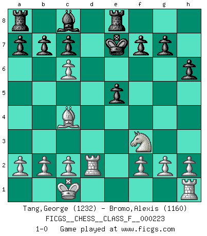 Last move : 1-0 2020 January 22 8:40:59 [Event "FICGS__CHESS__CLASS_F__000223"] [Site "FICGS"] [Date "2020.01.04"] [Round "1"] [White "Tang,George"] [Black "Bromo,Alexis"] [Result "1-0"] [WhiteElo "1232"] [BlackElo "1160"] 1.e4 e5 2.d4 d6 3.dxe5 dxe5 4.Qxd8+ Kxd8 5.Nf3 Nc6 6.Bc4 h6 7.Nc3 Bb4 8.Bd2 Nf6 9.O-O-O Ke7 10.Nd5+ Nxd5 11.exd5 Bxd2+ 12.Rxd2 Re8 13.dxc6 1-0 King's pawn game Queenside Castling by player White (move 9) Player White won this chess game. Follow this game move after move (download)Chess is like war on a board. (Bobby Fischer) Der Verteidiger gebe der Gewalt nach, aber nur der Gewalt. Er schaffe sich nicht freiwillig, etwa aus Blindheit oder aus Schrecken, irgendwelche Schwächen. Er lasse sich nicht bluffen. (Emanuel Lasker) El Ajedrez es el gimnasio de la mente. (Blaise Pascal) Horreur, mais aussi harmonie suprême : qu'y avait-il en effet au monde en dehors des échecs ? Le brouillard, l'inconnu, le non-être... (Vladimir Nabokov) The real voyage of discovery consists not in seeking new lands but in seeing with new eyes. (Marcel Proust)