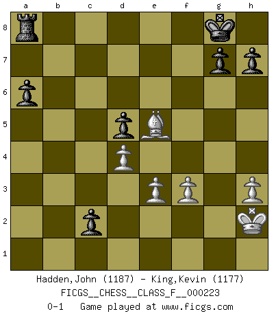 Last move : 0-1 2020 May 11 2:38:28 [Event "FICGS__CHESS__CLASS_F__000223"] [Site "FICGS"] [Date "2020.01.04"] [Round "1"] [White "Hadden,John"] [Black "King,Kevin"] [Result "0-1"] [WhiteElo "1187"] [BlackElo "1177"] 1.d4 f5 2.Nc3 e6 3.Bf4 Bb4 4.a3 Bxc3+ 5.bxc3 Nf6 6.e3 d5 7.c4 O-O 8.cxd5 exd5 9.Nf3 c6 10.Bd3 Ne4 11.O-O Be6 12.Rc1 b5 13.Bxe4 fxe4 14.Nd2 Nd7 15.c3 Nb6 16.Nb3 Nc4 17.Ra1 Qe8 18.Nc5 Qg6 19.Nxe6 Qxe6 20.a4 Nb2 21.Qb3 Nc4 22.Rfc1 a6 23.Bg3 Rf5 24.axb5 cxb5 25.Ra2 Nb6 26.Rb1 Na4 27.Qc2 Rf6 28.h3 Qc6 29.Rc1 R6f8 30.Qe2 Nxc3 31.Qc2 Rfc8 32.Qd2 Ne2+ 33.Qxe2 Qxc1+ 34.Kh2 Qc4 35.Qxc4 Rxc4 36.f3 exf3 37.gxf3 b4 38.Be5 b3 39.Rb2 Rc2+ 40.Rxc2 bxc2 0-1 Dutch Kingside Castling by player Black (move 7) Kingside Castling by player White (move 11) Player Black won this chess game. Follow this game move after move (download)He who fears an isolated Queen's Pawn should give up Chess. (Siegbert Tarrasch) Nach Morphy wurde nichts neues mehr in der Behandlung offener Positionen gefunden. (Mikhail Moiseyevich Botvinik) No hay precio que sea tan grande por la cabellera del Rey enemigo. (Koblentz) Le moment que je préfère le plus dans une rencontre, c'est celui où je sens que la personnalité de l'adversaire se brise. (Robert Fischer) In fact if nothing is done against this teddy bear, hereby I announce that I would quit chess, rapid chess, blitz chess, postal chess, email chess, server chess and correspondence chess I will then switch to a table game where teddy bears aren't going to be seen for a while, like Poker, or Roulette, all 18+ games. (Elmer Valderrama)