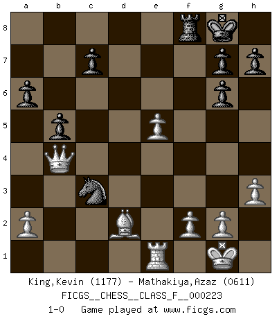 Last move : 1-0 2020 May 16 7:47:9 [Event "FICGS__CHESS__CLASS_F__000223"] [Site "FICGS"] [Date "2020.01.04"] [Round "1"] [White "King,Kevin"] [Black "Mathakiya,Azaz"] [Result "1-0"] [WhiteElo "1177"] [BlackElo "0611"] 1.c4 e5 2.Nc3 Nf6 3.Nf3 Nc6 4.e3 Bb4 5.d4 d6 6.Bd2 exd4 7.exd4 O-O 8.Be2 Bg4 9.Be3 Bxc3+ 10.bxc3 Na5 11.Bd3 Qd7 12.O-O Rae8 13.h3 Bh5 14.Kh2 Bg6 15.Re1 b6 16.Bxg6 fxg6 17.c5 Nc4 18.cxd6 Qxd6+ 19.Kh1 Qc6 20.Qc2 Nd5 21.Bg5 Rxe1+ 22.Rxe1 b5 23.Qe4 a6 24.Kg1 Qd7 25.Ne5 Nxe5 26.dxe5 Nxc3 27.Qb4 Qd2 28.Bxd2 1-0 English Opening Kingside Castling by player Black (move 7) Kingside Castling by player White (move 12) Player White won this chess game. Follow this game move after move (download)Chess is everything: art, science and sport. (Anatoly Karpov) Darum geht es im Schach. Einen Tag gibst du deinem Gegner eine Lektion, am nächsten Tag gibt er dir eine. (Robert James Fischer) El Ajedrez detiene a su maestro dentro de sus propios vínculos, encadenando la mente y el cerebro, por lo que la libertad interior del mas fuerte debe sufrir. (Albert Einstein) La menace est plus forte que l'exécution. (Aaron Nimzovitch) In God we trust, all others we virus scan. (Anonymous)
