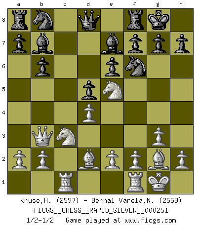 Last move : 1/2-1/2 2020 March 6 15:43:19 [Event "FICGS__CHESS__RAPID_SILVER__000251"] [Site "FICGS"] [Date "2020.01.05"] [Round "1"] [White "Kruse,Herbert"] [Black "Bernal Varela,Nelson"] [Result "1/2-1/2"] [WhiteElo "2597"] [BlackElo "2559"] 1.d4 e6 2.Nf3 d5 3.c4 Nf6 4.g3 Bb4+ 5.Bd2 Be7 6.Bg2 O-O 7.O-O c6 8.Qb3 b6 9.Nc3 Ba6 10.cxd5 cxd5 11.Ne5 Bb7 12.Rac1 Nbd7 13.Nd3 Nb8 14.Ne5 Nbd7 15.Nd3 Nb8 16.Ne5 1/2-1/2 Queen's pawn Kingside Castling by player Black (move 6) Kingside Castling by player White (move 7) This chess game ended in a draw. Follow this game move after move (download)Though most people love to look at the games of the great attacking masters, some of the most successful players in history have been the quiet positional players. They slowly grind you down by taking away your space, tying up your pieces, and leaving you with virtually nothing to do ! (Yasser Seirawan) Es genügt nicht ein guter Spieler zu sein, man muß auch gut spielen. (Siegbert Tarrasch) No hay precio que no valga la pena por la cabellera del Rey enemigo. (Koblentz) Même si vous avez un bon coup à faire, regardez toujours s'il n'y en a pas un qui lui soit préférable. (Pedro Damiano) Without enthusiasm, virtue functions not at all, and vice only poorly. (Mignon McLaughlin, The Neurotic's Notebook, 1960)