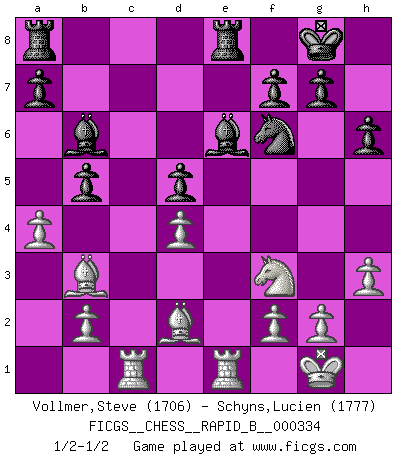 Last move : 1/2-1/2 2020 February 2 12:47:47 [Event "FICGS__CHESS__RAPID_B__000334"] [Site "FICGS"] [Date "2020.01.05"] [Round "1"] [White "Vollmer,Steve"] [Black "Schyns,Lucien"] [Result "1/2-1/2"] [WhiteElo "1706"] [BlackElo "1777"] 1.d4 d5 2.c4 dxc4 3.e3 e5 4.Bxc4 exd4 5.exd4 Bd6 6.Nf3 Nf6 7.Qe2+ Qe7 8.Qxe7+ Bxe7 9.O-O O-O 10.Nc3 Nbd7 11.Bf4 c6 12.Rfe1 Nb6 13.Bb3 Re8 14.Ng5 Nbd5 15.Nxd5 cxd5 16.Rac1 h6 17.Nf3 Be6 18.Rc7 b5 19.h3 Bd8 20.R7c1 Ba5 21.Bd2 Bb6 22.a4 1/2-1/2 Queen's gambit accepted Kingside Castling by player White (move 9) Kingside Castling by player Black (move 9) This chess game ended in a draw. Follow this game move after move (download)Fischer prefers to enter Chess history alone. (Miguel Najdorf) Wenn es im Universum noch irgendwo intelligente Lebewesen gibt, dann kennen sie Go. (Emanuel Lasker) Bobby Fischer es el mas grande genio de Ajedrez de todos los tiempos. (Alexander Kotov) On est toujours la mazette de quelqu'un d'autre. (Anonyme) Fear is the path to the dark side. Fear leads to anger; anger leads to hate; hate leads to suffering. I sense much fear in you. (Master Yoda in Star Wars ep.1)