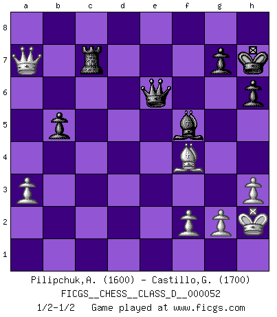 Last move : 1/2-1/2 2007 November 17 18:0:23 [Event "FICGS__CHESS__CLASS_D__000052"] [Site "FICGS"] [Date "2007.07.04"] [Round "1"] [White "Pilipchuk,Andrey"] [Black "Castillo,German"] [Result "1/2-1/2"] [WhiteElo "1600"] [BlackElo "1700"] 1.d4 d5 2.c4 dxc4 3.Nf3 Nf6 4.e3 e6 5.Bxc4 c5 6.O-O a6 7.Bb3 Nc6 8.Nc3 cxd4 9.exd4 Be7 10.Bg5 O-O 11.Rc1 h6 12.Bf4 Na5 13.Bc2 b5 14.Ne5 Bb7 15.Qd3 Re8 16.Ng4 Kf8 17.Nxf6 Bxf6 18.Qh7 Ke7 19.Rfd1 Nc4 20.d5 Rh8 21.Qe4 Ke8 22.Qe2 Bxc3 23.dxe6 Qf6 24.exf7+ Kf8 25.Be4 Qe6 26.Rxc3 Bxe4 27.b3 Bf5 28.Qf3 Kxf7 29.bxc4 Rhd8 30.cxb5 axb5 31.Rc7+ Kg8 32.Rxd8+ Rxd8 33.h3 Rd3 34.Qa8+ Kh7 35.Qa7 Rd1+ 36.Kh2 Rd7 37.a3 Rxc7 1/2-1/2 QGA : Classical, 6...a6 Kingside Castling by player White (move 6) Kingside Castling by player Black (move 10) This chess game ended in a draw. Follow this game move after move (download)The game of Chess is not merely an idle amusement; several very valuable qualities of the mind are to be acquired and strengthened by it, so as to become habits ready on all occasions; for life is a kind of Chess. (Benjamin Franklin) Obwohl ich vom Stil her kaum zu den Priestern der Schachkunst gezählt werde, halte ich Schach doch für eine Kunst. (Tigran Petrosjan) El poder defensivo de una pieza clavada, solamente es imaginario. (Aaron Nimzovich) Le système Elo représente seulement une moyenne. Il est simplement un indicateur de votre stabilité. (Anatoli Karpov) Now the reason the enlightened prince and the wise general conquer the enemy whenever they move and their achievements surpass those of ordinary men is foreknowledge. (Sun Tzu)