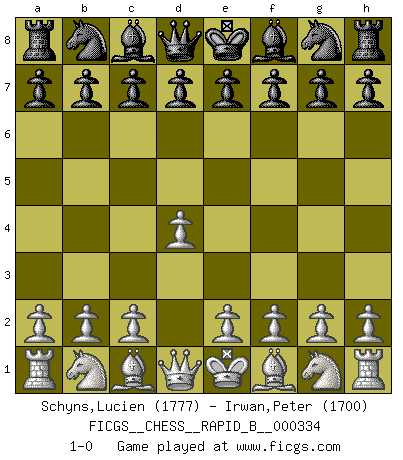 Last move : 1-0 2020 February 5 11:42:8 [Event "FICGS__CHESS__RAPID_B__000334"] [Site "FICGS"] [Date "2020.01.05"] [Round "1"] [White "Schyns,Lucien"] [Black "Irwan,Peter"] [Result "1-0"] [WhiteElo "1777"] [BlackElo "1700"] 1.d4 1-0 This chess game has been lost on time (started : 2020.01.05 18:54:37) Queen's pawn Player White won this chess game. Follow this game move after move (download)It is difficult to play against Einstein's theory --on his first loss to Fischer. (Mikhail Tal) Ich bewundere Kasparows phantasievolle Angriffssiege aus den Achtzigern und Neunzigern, aber wenn man sie mit dem Computer überprüft, nimmt der Computer in jeder zweiten Partie die Opfer an, verteidigt sich und gewinnt. (Vladimir Kramnik) Los problemas de Ajedrez exigen del compositor las mismas virtudes que caracterizan todo el arte de valor: originalidad, invención, concisión, armonía, complejidad e insinceridad explendida. (Vladimir Nabokov) Soyez une menace à chaque fois que vous vous asseyez pour jouer. (Ken Smith) All politicians must be presumed guilty until they are proven innocent. (Dinesh De Silva)