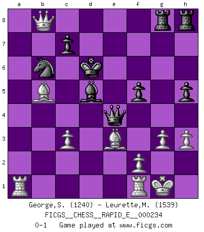 Last move : 0-1 2020 January 24 11:45:51 [Event "FICGS__CHESS__RAPID_E__000234"] [Site "FICGS"] [Date "2020.01.05"] [Round "1"] [White "George,Sebastine"] [Black "Leurette,Marc-Antoine"] [Result "0-1"] [WhiteElo "1240"] [BlackElo "1539"] 1.h3 e5 2.a3 d5 3.e3 Nf6 4.d4 e4 5.c4 b6 6.cxd5 Nxd5 7.Nc3 Nxc3 8.bxc3 Bb7 9.Bc4 Bd6 10.Ne2 Nd7 11.O-O Qe7 12.Nf4 Bxf4 13.exf4 f5 14.Be3 O-O-O 15.a4 h6 16.a5 g5 17.axb6 Nxb6 18.Be2 Kb8 19.Qb3 gxf4 20.Bxf4 h5 21.Qa2 e3 22.Qxa7+ Kc8 23.Bxe3 Rdg8 24.g3 Qe4 25.d5 Bxd5 26.Ba6+ Kd8 27.Qb8+ Kd7 28.Bb5+ Kd6 0-1 Global Opening Kingside Castling by player White (move 11) Queenside Castling by player Black (move 14) Player Black won this chess game. Follow this game move after move (download)Chess is a part of culture and if a culture is declining then Chess too will decline. (Mikhail Botvinnik) Es gibt Leute, die glauben, alles wäre vernünftig, was man mit einem ernsthaften Gesicht tut. (Georg Christoph Lichtenberg) Un mal día en el Ajedrez, es mejor que cualquier buen día en el trabajo. (Anonymous) L'attaque fait le spectacle, la défense gagne les matchs. (Dicton footballistique) Always be a first-rate version of yourself, instead of a second-rate version of somebody else. (Judy Garland)
