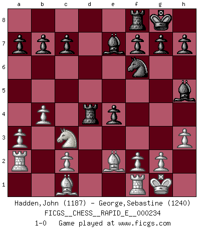 Last move : 1-0 2020 March 26 15:58:7 [Event "FICGS__CHESS__RAPID_E__000234"] [Site "FICGS"] [Date "2020.01.05"] [Round "1"] [White "Hadden,John"] [Black "George,Sebastine"] [Result "1-0"] [WhiteElo "1187"] [BlackElo "1240"] 1.d4 Nc6 2.Nf3 d6 3.e3 Nf6 4.Nc3 Bg4 5.Be2 e5 6.dxe5 dxe5 7.O-O Be7 8.h3 Bh5 9.Qxd8+ Rxd8 10.a3 O-O 11.b4 e4 12.Nd4 Nxd4 13.exd4 Rxd4 14.Ra2 1-0 This chess game has been lost on time (started : 2020.01.05 23:18:1) Queen's pawn : Lundin (Kevitz-Mikenas) defense Kingside Castling by player White (move 7) Kingside Castling by player Black (move 10) Player White won this chess game. Follow this game move after move (download)If Chess is a science, it's a most inexact one. If Chess is an art, it is too exacting to be seen as one. If Chess is a sport, it's too esoteric. If Chess is a game, it's too demanding to be just a game. If Chess is a mistress, she's a demanding one. If Chess is a passion, it's a rewarding one. If Chess is life, it's a sad one. (Unknown) Es gibt zwei Arten von Opfern: Korrekte und meine. (Mikhail Nekhemyevich Tal) Los Peones son el alma de una partida de Ajedrez. (Francois Andre Danican Philidor) On est toujours la mazette de quelqu'un d'autre. (Anonyme) I feel so... helpless. (C-3PO in Star Wars ep.3)