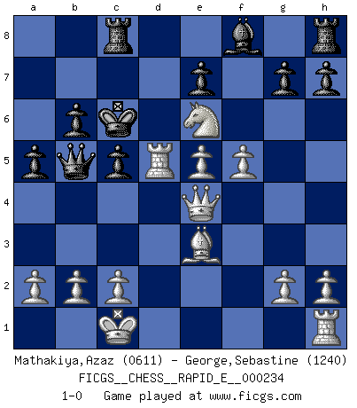 Last move : 1-0 2020 February 17 18:31:26 [Event "FICGS__CHESS__RAPID_E__000234"] [Site "FICGS"] [Date "2020.01.05"] [Round "1"] [White "Mathakiya,Azaz"] [Black "George,Sebastine"] [Result "1-0"] [WhiteElo "0611"] [BlackElo "1240"] 1.e4 Nc6 2.d4 d6 3.d5 Ne5 4.f4 Ng6 5.Nc3 f5 6.Bb5+ Bd7 7.exf5 Bxb5 8.Nxb5 Nh4 9.Qh5+ Kd7 10.Qxh4 Nf6 11.Nd4 Nxd5 12.Ngf3 c5 13.Ne6 Qa5+ 14.Bd2 Qb5 15.O-O-O a5 16.Ne5+ dxe5 17.Be3 Kc6 18.Rxd5 b6 19.fxe5 Rc8 20.Qe4 1-0 KP : Nimzovich defense Queenside Castling by player White (move 15) Player White won this chess game. Follow this game move after move (download)The enormous mental resilience, without which no Chess player can exist, was so much taken up by Chess that he could never free his mind of this game. (Albert Einstein) Bis zum Jahr 1971 verlief in meiner Schachkariere alles glatt. Dieses dramatische Match [Fischer-Taimanov 6:0] machte mein Leben zur Hölle. (Mark Taimanov) Observen a Garry Kasparov. Después de una derrota, invariablemente el gana la próxima partida. Prácticamente hace pedazos a su siguiente oponente. Eso es algo que tenemos que aprender a lograr. (Maurice Ashley) Le thème de l'attaque double intervient d'une manière ou d'une autre dans l'immense majorité des combinaisons. (Youri Averbakh) A good aphorism is too hard for the tooth of time, and is not worn away with the centuries, although it serves as food for every speech. (Friedrich Nietzsche)