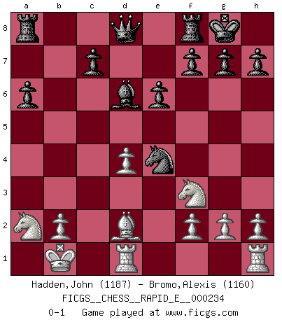 Last move : 0-1 2020 February 22 21:39:1 [Event "FICGS__CHESS__RAPID_E__000234"] [Site "FICGS"] [Date "2020.01.05"] [Round "1"] [White "Hadden,John"] [Black "Bromo,Alexis"] [Result "0-1"] [WhiteElo "1187"] [BlackElo "1160"] 1.d4 d5 2.Nf3 Nc6 3.Nc3 Nf6 4.e3 Bf5 5.Bd3 Bxd3 6.Qxd3 e6 7.Bd2 Bd6 8.O-O-O a6 9.Kb1 b5 10.a3 b4 11.axb4 Nxb4 12.Na2 Nxd3 13.cxd3 O-O 14.e4 dxe4 15.dxe4 Nxe4 0-1 Queen's pawn game, Chigorin variation Queenside Castling by player White (move 8) Kingside Castling by player Black (move 13) Player Black won this chess game. Follow this game move after move (download)Chess is a sea in which a gnat may drink and an elephant may bathe. (Hindu proverb) Am wohlsten fühle ich mich, wenn ich sehe, wie sich mein Gegner im Todeskampf windet. (Robert James Fischer) Personalmente, yo prefiero mirar hacia el futuro en donde un programa de computadora gane el título mundial de Ajedrez. La humanidad necesita una lección de humildad. (Richard Dawkings) Il (Jacob Murray) ne joue pas pour le bon coup, mais pour le meilleur. (Eloi Relange) No enterprise is more likely to succeed than one concealed from the enemy until it is ripe for execution. (Niccolo Machiavelli)