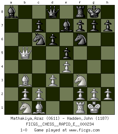 Last move : 1-0 2020 March 6 1:19:1 [Event "FICGS__CHESS__RAPID_E__000234"] [Site "FICGS"] [Date "2020.01.05"] [Round "1"] [White "Mathakiya,Azaz"] [Black "Hadden,John"] [Result "1-0"] [WhiteElo "0611"] [BlackElo "1187"] 1.e4 e5 2.Nf3 Nc6 3.Bb5 a6 4.Ba4 b5 5.Bb3 d6 6.a4 Bb7 7.axb5 axb5 8.Rxa8 Bxa8 9.Qe2 Nf6 10.Qxb5 Be7 11.O-O O-O 12.d3 1-0 This chess game has been lost on time (started : 2020.01.05 23:18:1) Ruy Lopez : Caro variation Kingside Castling by player White (move 11) Kingside Castling by player Black (move 11) Player White won this chess game. Follow this game move after move (download)The older I grow, the more I value pawns. (Paul Keres) Um dein Spiel zu verbessern musst du zuallererst das Endspiel studieren, denn diese kann unabhängig studiert werden. Die Eröffnung und das Mittelspiel müssen immer in Bezug gesetzt werden zum Endspiel. (José Raúl Capablanca) El Ajedrez es imaginación. (David Bronstein) Un millionnaire : 'Monsieur Steinitz ! Vous ne participez aux tournois que pour l'argent, alors que moi je n'y viens que pour l'honneur.' Steinitz : 'Chacun joue pour ce qu'il n'a pas'... I've never seen so many men wasted so badly. (Blondie in The Good, The Bad and The Ugly)
