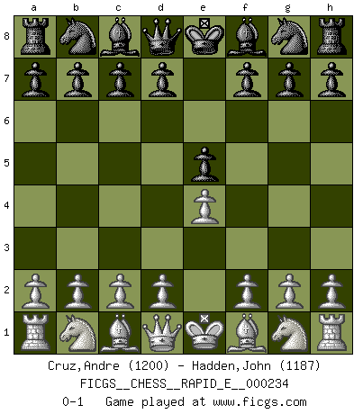 Last move : 0-1 2020 February 13 12:14:55 [Event "FICGS__CHESS__RAPID_E__000234"] [Site "FICGS"] [Date "2020.01.05"] [Round "1"] [White "Cruz,Andre"] [Black "Hadden,John"] [Result "0-1"] [WhiteElo "1200"] [BlackElo "1187"] 1.e4 e5 0-1 This chess game has been lost on time (started : 2020.01.05 23:18:1) King's pawn game Player Black won this chess game. Follow this game move after move (download)I have never in my life played the French Defence, which is the dullest of all openings. (Wilhelm Steinitz) Im Schach gibt es keinen Platz für Galanterie. (Irving Chernev) Nunca nadie ha ganado una partida de Ajedrez rindiendose. (Unknown) J'ai vu le vaincu d'Echecs jouer des années durant dans l'espoir de la fête de la victoire. Car tu es plus riche de ce qu'elle existe si même elle n'est point pour toi. Ainsi de la perle du fond des mers. (Antoine de Saint-Exupéry) If I had no sense of humor, I would long ago have committed suicide. (Mahatma Gandhi)