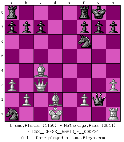 Last move : 0-1 2020 February 1 7:45:3 [Event "FICGS__CHESS__RAPID_E__000234"] [Site "FICGS"] [Date "2020.01.05"] [Round "1"] [White "Bromo,Alexis"] [Black "Mathakiya,Azaz"] [Result "0-1"] [WhiteElo "1160"] [BlackElo "0611"] 1.e4 e6 2.d4 d5 3.exd5 exd5 4.c4 Nc6 5.Nf3 Bb4+ 6.Nc3 Nf6 7.Bd2 Bg4 8.h3 Bxf3 9.Qxf3 O-O 10.a3 Nxd4 11.Qd3 dxc4 12.Qxc4 Nc2+ 13.Kd1 Bxc3 14.Qxc3 Nxa1 15.Bd3 Qd5 16.Bc4 Qxg2 0-1 French : Exchange variation Kingside Castling by player Black (move 9) Player Black won this chess game. Follow this game move after move (download)Man is a frivolous, a specious creature, and like a Chess player, cares more for the process of attaining his goal than for the goal itself. (Dostoyevsky) Es ist schade, dass viele Schachsportler vergessen, wie wichtig Auftreten und angemessene Kleidung sind. (Alexandra Kosteniuk) Tu eres para mi la Reina en d8 y yo soy el Peón en d7!!. (GM Eduard Gufeld) A ce moment-là, je menaçais de comprendre la position ! (Clément L'Heureux) Who needs drugs and alcohol if he can play Big Chess at FICGS ? (Heinz-Georg Lehnhoff)