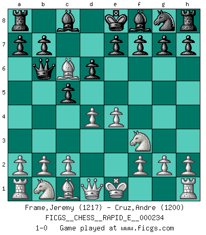 Last move : 1-0 2020 February 10 12:29:31 [Event "FICGS__CHESS__RAPID_E__000234"] [Site "FICGS"] [Date "2020.01.05"] [Round "1"] [White "Frame,Jeremy"] [Black "Cruz,Andre"] [Result "1-0"] [WhiteElo "1217"] [BlackElo "1200"] 1.e4 c5 2.Nf3 Nc6 3.d4 d6 4.Bb5 Qb6 5.Bxc6+ 1-0 This chess game has been lost on time (started : 2020.01.05 23:18:1) Sicilian defense Player White won this chess game. Follow this game move after move (download)A Chess game is divided into three stages: the first, when you hope you have the advantage, the second when you believe you have an advantage, and the third... when you know you're going to lose ! (Savielly Tartakower) Konzentriere dich auf materielle Gewinne. Nimm, was dir dein Gegner gibt, ausser es gibt einen guten Grund der dagegenspricht. (Robert James Fischer) En posiciones complicadas, Bobby Fischer pocas veces tuvo que temer de cualquiera. (Paul Keres) Les échecs sont utiles à l'exercice de la faculté de penser et à celle de l'imagination. Car nous devons posséder une méthode élaborée pour atteindre des buts partout où nous devons conduire notre raison. (Leibnitz) Lottery : A tax on people who are bad at math. (Author unknown)
