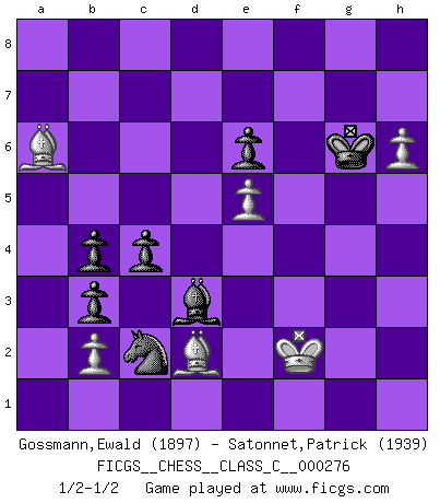 Last move : 1/2-1/2 2020 March 1 11:37:25 [Event "FICGS__CHESS__CLASS_C__000276"] [Site "FICGS"] [Date "2020.01.06"] [Round "1"] [White "Gossmann,Ewald"] [Black "Satonnet,Patrick"] [Result "1/2-1/2"] [WhiteElo "1897"] [BlackElo "1939"] 1.d4 f5 2.g3 Nf6 3.Nf3 g6 4.Bg2 Bg7 5.O-O O-O 6.c4 d6 7.Nc3 c6 8.Qc2 Na6 9.Re1 Qc7 10.c5 dxc5 11.Bf4 Qa5 12.e3 Be6 13.Rad1 Nb4 14.Qd2 Ne4 15.Nxe4 fxe4 16.Ne5 Bxa2 17.Bxe4 Qb5 18.Nd7 Rfe8 19.Be5 Rad8 20.Bxg7 Rxd7 21.Be5 Be6 22.Qc3 c4 23.Bb1 Nd5 24.Qc1 Nf6 25.f3 c5 26.e4 cxd4 27.Bxd4 Red8 28.Qe3 Qa5 29.Bc3 Qb6 30.Qxb6 axb6 31.Bc2 Rxd1 32.Rxd1 Rxd1+ 33.Bxd1 b5 34.Kf2 Nd7 35.f4 Nb8 36.Ke3 Nc6 37.Be2 b4 38.Bd2 b5 39.Bf3 Kf8 40.h4 h5 41.f5 Bf7 42.fxg6 Bxg6 43.g4 hxg4 44.Bxg4 Be8 45.Kf4 b3 46.e5 Bg6 47.h5 Bd3 48.Bd7 Nd4 49.Bc8 Kf7 50.Ba6 Ke6 51.Bc8+ Kf7 52.Ba6 Ke6 53.h6 Kf7 54.Ke3 Nc2+ 55.Kf2 b4 56.Bc1 e6 57.Bd2 Kg6 58.Bb5 Kh7 59.Ba6 Kg6 60.Bb5 Kh7 61.Ba6 Kg6 1/2-1/2 Dutch defense Kingside Castling by player White (move 5) Kingside Castling by player Black (move 5) This chess game ended in a draw. Follow this game move after move (download)It began to feel as though you were playing against Chess itself. - On playing against Robert Fischer. (Walter Shipman) Ein typischer, sehr verbreiteter Gedankenschädling ist der, daß der betreffende Amateur von der Annanhme ausgeht, daß jeder einzelne Zug etwas zu leisten habe. (Aaron Nimzowitsch) Solo el jugador con la iniciativa tiene el derecho a atacar. (Wilhelm Steinitz) La solitude du joueur d'Echecs à l'approche du mat est semblable à celle du condamné. (Francis Szpiner) Creativity is allowing yourself to make mistakes. Art is knowing which ones to keep. (Scott Adams)
