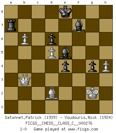 Last move : 1-0 2020 August 31 20:43:6 [Event "FICGS__CHESS__CLASS_C__000276"] [Site "FICGS"] [Date "2020.01.06"] [Round "1"] [White "Satonnet,Patrick"] [Black "Voudouris,Nick"] [Result "1-0"] [WhiteElo "1939"] [BlackElo "1924"] 1.e4 c5 2.Nf3 d6 3.Bb5+ Nd7 4.d4 cxd4 5.Qxd4 a6 6.Bxd7+ Bxd7 7.O-O Nf6 8.c4 g6 9.b3 Bg7 10.Nc3 O-O 11.Bb2 b5 12.Nd5 e5 13.Qe3 Nxd5 14.cxd5 f5 15.Rac1 a5 16.h3 Bf6 17.Rfe1 Rf7 18.Qd3 Qb8 19.Qe2 fxe4 20.Qxe4 b4 21.Rc4 Bb5 22.Rc2 Qb7 23.Bc1 Bd7 24.Qe2 Raf8 25.Bh6 Bg7 26.Be3 e4 27.Ng5 Re7 28.Rd1 Bb5 29.Qg4 Rfe8 30.Ne6 Bc3 31.Qg5 Bd3 32.R2c1 Qd7 33.h4 Rf7 34.Bd2 Qa7 35.Be3 Qe7 36.Qg3 Be5 37.Qh3 h5 38.Rc7 Qxc7 39.Nxc7 Rxc7 40.f4 Bf6 41.Qg3 Rg7 42.Rc1 Bb5 43.Bb6 Bd7 44.Qe3 Bxh4 45.Rc7 Bf6 46.Bxa5 g5 47.f5 Bxf5 48.Rxg7+ Kxg7 49.Bxb4 Rc8 50.a4 Kg6 51.a5 h4 52.a6 g4 53.Bd2 Rc2 54.a7 Ra2 55.g3 Ra1+ 56.Kh2 Kf7 57.gxh4 Be5+ 58.Kg2 Bg6 59.b4 Ke8 60.b5 Bf7 61.Qb3 Rxa7 62.b6 1-0 Sicilian : Canal-Sokolsky (Nimzovich-Rossolimo, Moscow) attack Kingside Castling by player White (move 7) Kingside Castling by player Black (move 10) Player White won this chess game. Follow this game move after move (download)Chess is a cold bath for the mind. (Sir John Simon) Pläne sind die Träume des Verständigen. (Ernst Freiherr von Feuchtersleben) No soy una persona materialista y por eso, no resiento la falta o pérdida del dinero. La ausencia de cosas mundanas carece de importancia. Ya que el Ajedrez es una forma en la que puedo ser tan materialista como yo desee sin tener la necesidad de vender mi alma. (Jamie Walter Adams) Ce qui est bien, c'est d'avoir tout un tas de pièces en prise : l'adversaire ne peut en prendre qu'une à la fois. Cité par Thierry Audin. Don't anthropomorphize computers - they hate it. (Anonymous)
