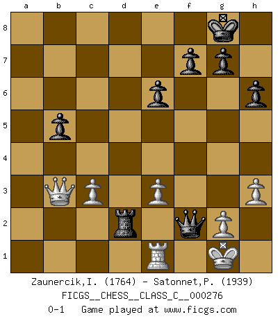 Last move : 0-1 2020 February 16 18:24:14 [Event "FICGS__CHESS__CLASS_C__000276"] [Site "FICGS"] [Date "2020.01.06"] [Round "1"] [White "Zaunercik,Ilmar"] [Black "Satonnet,Patrick"] [Result "0-1"] [WhiteElo "1764"] [BlackElo "1939"] 1.e4 c5 2.Nf3 Nc6 3.Bc4 d6 4.c3 Nf6 5.d3 a6 6.O-O Na5 7.Bb3 Nxb3 8.Qxb3 e6 9.Bg5 Be7 10.a4 h6 11.Bh4 b6 12.Nbd2 Rb8 13.Rfe1 O-O 14.d4 Bb7 15.e5 dxe5 16.dxe5 Nd7 17.Bxe7 Qxe7 18.Qc4 b5 19.axb5 axb5 20.Qg4 Ra8 21.Ne4 c4 22.Nd6 Bxf3 23.Qxf3 Rxa1 24.Rxa1 Nxe5 25.Qd1 Rd8 26.Ra6 Qb7 27.Ra1 Qb6 28.b3 Rxd6 29.Qe2 Qd8 30.bxc4 Nxc4 31.h3 Rd3 32.Qh5 Qd7 33.Rc1 Qc6 34.Qe2 Qd5 35.Qc2 Rd2 36.Qb3 Qc5 37.Rf1 Ne3 38.Re1 Qf5 39.fxe3 Qf2+ 0-1 Sicilian defense Kingside Castling by player White (move 6) Kingside Castling by player Black (move 13) Player Black won this chess game. Follow this game move after move (download)I believe that Chess possesses a magic that is also a help in advanced age. A rheumatic knee is forgotten during a game of Chess and other events can seem quite unimportant in comparison with a catastrophe on the chessboard. (Vlastimil Hort) Je mehr wir mit Computern analysieren, desto mehr glauben wir an Verteidigung. (Vladimir Kramnik) El muchacho (en ese entonces un niño de 12 años llamado Anatoly Karpov) no tiene ni idea de lo que es el Ajedrez y no hay futuro en absoluto para el en esta profesión. (Mikhail Botvinnik) Les Echecs sont et restent toujours un combat, un combat intégral comme la boxe, la lutte ou un autre sport, et où il doit y avoir un vainqueur et un vaincu. (Joseph Emil Diemer) The obstacle is the path. (Zen proverb)