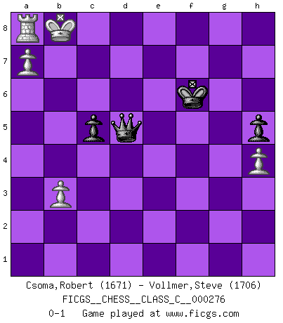 Last move : 0-1 2020 February 21 18:56:2 [Event "FICGS__CHESS__CLASS_C__000276"] [Site "FICGS"] [Date "2020.01.06"] [Round "1"] [White "Csoma,Robert"] [Black "Vollmer,Steve"] [Result "0-1"] [WhiteElo "1671"] [BlackElo "1706"] 1.c4 e5 2.Nc3 Nf6 3.d3 d5 4.cxd5 Nxd5 5.Nf3 Nc6 6.g3 Be7 7.Bg2 Be6 8.O-O f6 9.Bd2 Qd7 10.Rc1 g5 11.h4 g4 12.Nh2 h5 13.Re1 f5 14.e4 Nxc3 15.Bxc3 O-O 16.exf5 Bxf5 17.Bxe5 Nxe5 18.Rxe5 Bd6 19.Re2 Qb5 20.d4 Rae8 21.Rxe8 Rxe8 22.b3 Bb4 23.Bf1 Qb6 24.Be2 c6 25.Nf1 Ba3 26.Rc4 Bd6 27.Kh2 Be6 28.Ra4 Bf5 29.Ne3 Rxe3 30.fxe3 Bxg3+ 31.Kxg3 Qc7+ 32.Kf2 Qh2+ 33.Ke1 g3 34.Rxa7 g2 35.Kd2 g1Q 36.Qxg1+ Qxg1 37.Rxb7 Bg4 38.Bc4+ Kf8 39.a4 Qd1+ 40.Kc3 Qc1+ 41.Kb4 Qxe3 42.Kc5 Bf3 43.a5 Qc3 44.Ra7 Ke8 45.a6 Kd8 46.Ra8+ Ke7 47.Ra7+ Kf6 48.Ra8 Qa5+ 49.Kd6 Qb4+ 50.Kc7 Ke7 51.a7 Qd6+ 52.Kb7 c5 53.d5 Bxd5+ 54.Bxd5 Qxd5+ 55.Kb8 Kf6 0-1 English Opening Kingside Castling by player White (move 8) Kingside Castling by player Black (move 15) Promotion Queen by player Black (move 35) 10 pieces endgame at move 54 : White KRBPPP , Black KQPP WHITE : King + 1 Rook 1 Bishop 3 Pawns BLACK : King + 1 Queen 2 Pawns 9 pieces endgame at move 54 : White KRPPP , Black KQPP WHITE : King + 1 Rook 3 Pawns BLACK : King + 1 Queen 2 Pawns Player Black won this chess game. Follow this game move after move (download)Chess demands total concentration. (Bobby Fischer) Schach ist eine Sache der genauen Beurteilung, wann man zuschlagen und wann man sich ducken muss. (Robert James Fischer) El Ajedrez es imaginación. (David Bronstein) Les échecs, c'est l'art d'analyser. (Mikhail Botvinnik) As a goal marker shodan is important. As a destination it is a poor place to stop. (Thomas Tamayo)