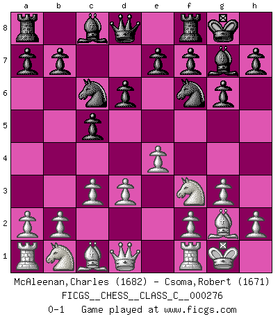 Last move : 0-1 2020 February 19 11:17:7 [Event "FICGS__CHESS__CLASS_C__000276"] [Site "FICGS"] [Date "2020.01.06"] [Round "1"] [White "McAleenan,Charles"] [Black "Csoma,Robert"] [Result "0-1"] [WhiteElo "1682"] [BlackElo "1671"] 1.e4 c5 2.Nf3 d6 3.d3 Nf6 4.g3 g6 5.Bg2 Bg7 6.O-O O-O 7.c3 Nc6 0-1 This chess game has been lost on time (started : 2020.01.06 8:8:20) Sicilian Kingside Castling by player White (move 6) Kingside Castling by player Black (move 6) Player Black won this chess game. Follow this game move after move (download)A good player is always lucky. (Jose Raul Capablanca) Der 70jährige Viktor Kortschnoi: Die Rentenanstalt wollte mich zwingen in Rente zu gehen. Meine Frau erhält jetzt eine Pension- und ich zahle weiter in die Rentenkasse ein! (Viktor Kortschnoi) En un gambito tu regalas un Peón por el bién de tomar un juego perdido. (Samuel Standige Boden) Les échecs sont un jeu par leur forme, un art par leur essence et une science par sa difficulté d'acquisition. Ils peuvent vous procurer autant de plaisir qu'un bon livre ou une belle musique, mais vous n'aurez une réelle joie que si vous arrivez à bien jouer. (Tigran Petrosian) You think that education is too expensive ? Try ignorance. (Derek Bok)