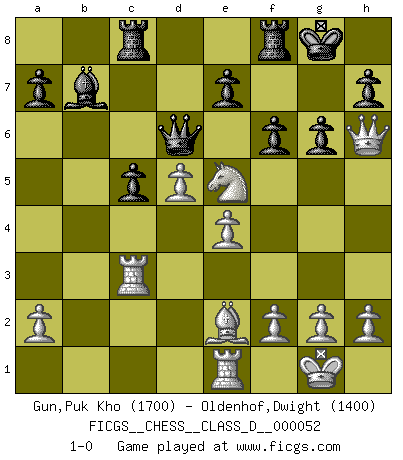 Last move : 1-0 2007 December 21 21:33:58 [Event "FICGS__CHESS__CLASS_D__000052"] [Site "FICGS"] [Date "2007.07.04"] [Round "1"] [White "Gun,Puk Kho"] [Black "Oldenhof,Dwight"] [Result "1-0"] [WhiteElo "1700"] [BlackElo "1400"] 1.c4 Nf6 2.Nf3 g6 3.Nc3 Bg7 4.e4 d6 5.d4 O-O 6.Be2 c6 7.O-O c5 8.dxc5 dxc5 9.Be3 b6 10.Qc2 Bb7 11.Rad1 Qc7 12.Nd5 Nxd5 13.cxd5 Nd7 14.Rfe1 Nf6 15.b4 Rac8 16.bxc5 bxc5 17.Rc1 Nd7 18.Qd2 Qd6 19.Bh6 Bxh6 20.Qxh6 f6 21.Rc3 Ne5 22.Nxe5 1-0 English Opening Kingside Castling by player Black (move 5) Kingside Castling by player White (move 7) Player White won this chess game. Follow this game move after move (download)By this measure (on the gap between Fischer & his contemporaries), I consider him the greatest world champion. (Garry Kasparov) Spielt Blackmar-Diemer-Gambit, und das Matt kommt von selbst! (Emil Joseph Diemer) Evita las multitudes. Haz independientemente tu propio razonamiento. Trata de ser el jugador de Ajedrez, no la pieza de Ajedrez. (Ralph Charell) Les échecs sont un jeu par leur forme, un art par leur essence et une science par sa difficulté d'acquisition. Ils peuvent vous procurer autant de plaisir qu'un bon livre ou une belle musique, mais vous n'aurez une réelle joie que si vous arrivez à bien jouer. (Tigran Petrosian) You think that education is too expensive ? Try ignorance. (Derek Bok)