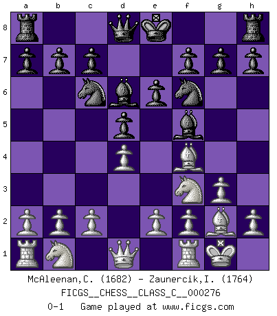 Last move : 0-1 2020 February 16 10:52:2 [Event "FICGS__CHESS__CLASS_C__000276"] [Site "FICGS"] [Date "2020.01.06"] [Round "1"] [White "McAleenan,Charles"] [Black "Zaunercik,Ilmar"] [Result "0-1"] [WhiteElo "1682"] [BlackElo "1764"] 1.Nf3 d5 2.g3 Nc6 3.d4 Nf6 4.Bg2 Bf5 5.O-O e6 6.Bf4 Bd6 0-1 This chess game has been lost on time (started : 2020.01.06 8:8:20) Reti : King's Indian attack (Barcza system) Kingside Castling by player White (move 5) Player Black won this chess game. Follow this game move after move (download)Dazzling combinations are for the many, shifting wood is for the few. (Georg Kieninger) Wer nie einen Fehler gemacht hat, hat nie etwas Neues ausprobiert. (Albert Einstein) Mi estilo es algo parecido entre un poco de Tal y Petrosian. (Reshevsky) Le plus grand jeu de l'esprit jamais inventé, plus vous l'apprenez, plus vous y prenez du plaisir. (Garry Kasparov) I believe in luck. How else can you explain the success of those you dislike ? (Jean Cocteau)