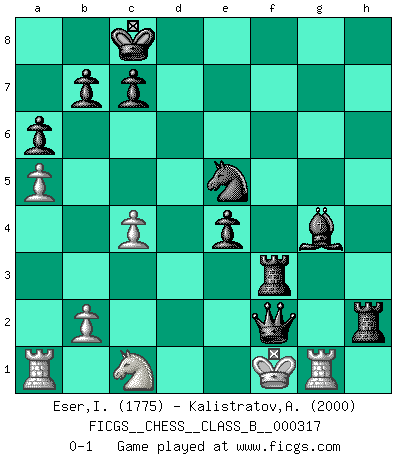 Last move : 0-1 2020 March 13 20:49:46 [Event "FICGS__CHESS__CLASS_B__000317"] [Site "FICGS"] [Date "2020.01.08"] [Round "1"] [White "Eser,Ipekyilmaz"] [Black "Kalistratov,Aleksandr"] [Result "0-1"] [WhiteElo "1775"] [BlackElo "2000"] 1.a3 e5 2.g3 d5 3.Bg2 Nf6 4.d3 Nc6 5.Bg5 Be6 6.Nd2 h6 7.Bxf6 Qxf6 8.e3 O-O-O 9.a4 g5 10.a5 a6 11.c3 Qg6 12.Qc2 h5 13.Ne2 h4 14.gxh4 Rxh4 15.Nf1 f5 16.Kd2 f4 17.f3 Bf5 18.Rg1 Bc5 19.Nc1 g4 20.Qd1 fxe3+ 21.Nxe3 Bxe3+ 22.Kxe3 Qg5+ 23.Kf2 Rxh2 24.Kf1 gxf3 25.Qxf3 e4 26.Qe2 Ne5 27.dxe4 dxe4 28.c4 Bg4 29.Qc2 Qf4+ 30.Ke1 Qg3+ 31.Kf1 Rf8+ 32.Bf3 Rxf3+ 33.Qf2 Qxf2+ 0-1 Anderssen's Opening Queenside Castling by player Black (move 8) Player Black won this chess game. Follow this game move after move (download)The beauty of a move lies not in its' appearance but in the thought behind it. (Siegbert Tarrasch) Ich glaube, ich kenne inzwischen die Gründe für mein Versagen: schachliche Charakterfehler. Ich war nie ein Wunderkind und in meiner gesamten menschlichen Entwicklung immer zu langsam. (Viktor Kortschnoi) Si el ingenio solamente fuese necesario para lucirse, las mujeres serían las mejores jugadoras de Ajedrez del mundo. (Albin) Seul un grand joueur sait à quel point il joue faiblement. (Xavier Tartacover) He who is a good ruler must first have been ruled. (Aristotle)