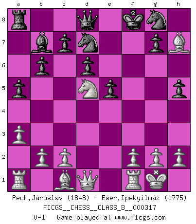 Last move : 0-1 2020 May 25 7:16:22 [Event "FICGS__CHESS__CLASS_B__000317"] [Site "FICGS"] [Date "2020.01.08"] [Round "1"] [White "Pech,Jaroslav"] [Black "Eser,Ipekyilmaz"] [Result "0-1"] [WhiteElo "1848"] [BlackElo "1775"] 1.e4 f6 2.d4 b6 3.Nf3 Bb7 4.Nc3 e6 5.a3 a6 6.Bd3 a5 7.O-O h6 8.Nh4 d6 9.Ng6 Rh7 10.d5 h5 11.e5 fxe5 12.Nxf8 Kxf8 13.Bxh7 exd5 14.Nxd5 Nd7 0-1 This chess game has been lost on time (started : 2020.01.08 14:15:7) Barnes defense Kingside Castling by player White (move 7) Player Black won this chess game. Follow this game move after move (download)Chess is no whit inferior to the violin, and we have a large number of professional violinists. (Mikhail Botvinnik) Gewöhnliche Menschen denken nur daran, wie sie ihre Zeit verbringen. Ein intelligenter Mensch versucht, sie auszunutzen. (Arthur Schopenhauer) En el Ajedrez, tal como es jugado por los Maestros, practicamente la suerte es eliminada. (Emanuel Lasker) Ne tendez aucun piège pour le plaisir ! Ne jouez rien dans l'espoir que l'adversaire réagisse de façon stupide ! Prenez toujours pour acquis que l'adversaire va trouver le meilleur coup ! Ne jouez jamais de coup dans l'espoir que l'adversaire ne voie pas la menace ! Chacun de vos coups doit améliorer la position d'une façon ou d'une autre. If you are going through hell, keep going. (Winston Churchill)